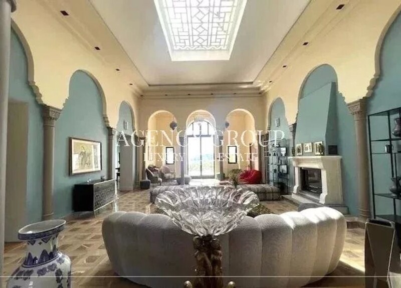 This property and its Moorish appearance will seduce you with its majestic south-facing panorama, panoramic view of the sea and hills. Built on a plot of approximately 3400m2 for a surface area of approximately 550m2, it is composed of an entrance, a triple living room with fireplace, a dining room, an indoor kitchen and an outdoor kitchen overlooking the swimming pool, five bedrooms, six-bathroom and toilets including two suites on the ground floor, a large games room/bar/TV, three south-facing terraces, a sauna, a hammam, a gym, a swimming pool with pool house. Parking for twelve cars and carport for three cars *Fees payable by the seller.
