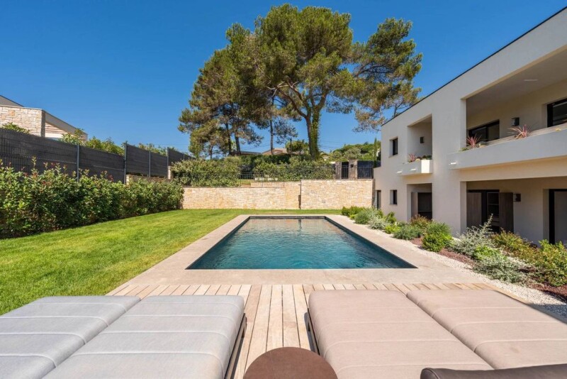 Located less than 5 minutes from the village of Valbonne, in a popular area, in a quiet and wooded environment. Located on a plot of 789m2, a magnificent contemporary villa, completely new, on 2 levels, comprising: - First floor: entrance hall, living/dining room, open-plan fitted kitchen, storeroom, shower room with WC, 25.30m2 terrace and staircase to garden level. - Garden level: bedroom with dressing room and shower room/WC, second bedroom, both opening onto a covered terrace, third bedroom, bathroom/shower room, guest WC, cellar with sink, covered terrace. - A landscaped Mediterranean garden with a swimming pool and a convivial outdoor area. - Two outdoor parking spaces.