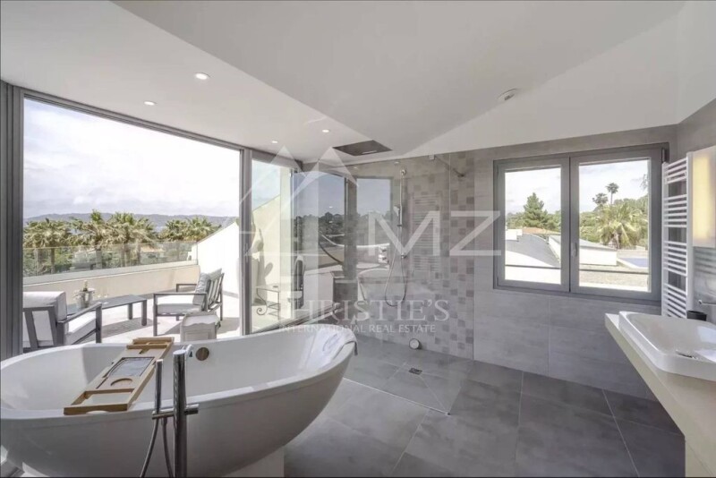 Discover this stunning 385 m² villa offering panoramic sea views, ideally located in a private domain on the western slopes of Cap d'Antibes. Just steps from the beaches and nestled in a peaceful, preserved environment, this property combines elegance and comfort. On the upper floor, the living areas open onto a large terrace with unobstructed views, while the spacious bedrooms are ideally arranged, each with en-suite bathrooms and shower rooms. An additional lounge and a second kitchen provide a welcoming space for relaxing with family or friends. On the top floor, a cinema room and a luxurious master suite with a bathroom enhance the unique experience of this property. The beautifully landscaped 1,200 m² garden invites relaxation with a heated 10x5 m pool and a pétanque court. A double garage completes the features of this villa, which combines absolute tranquility, luxury, and comfort in an exceptional setting on the French Riviera.