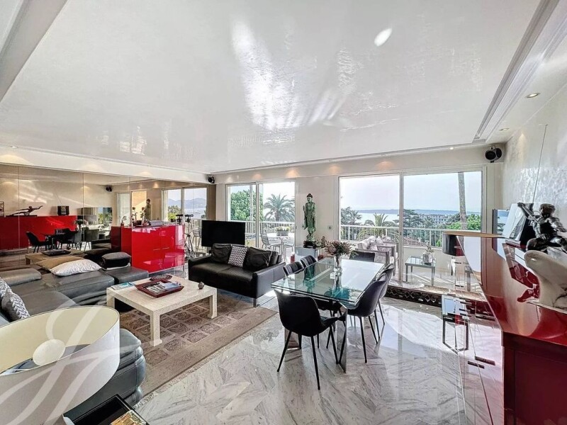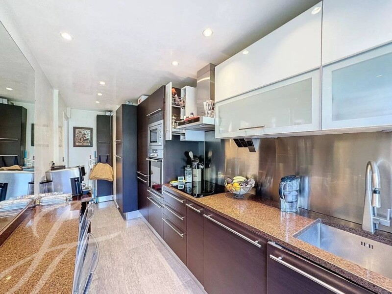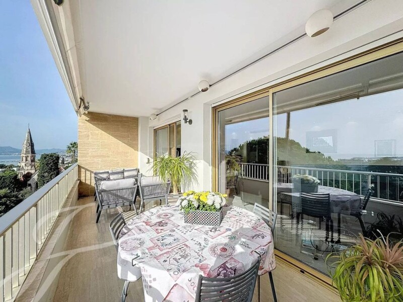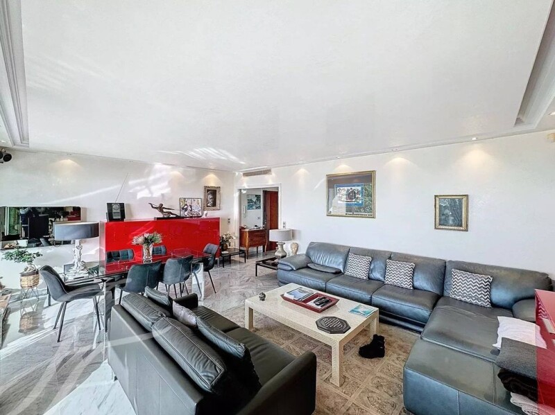 On the top floor of a small, secure luxury residence with park and swimming pool, this 107 m² apartment offers panoramic sea views. It comprises an entrance hall, fitted kitchen, living room, three spacious bedrooms, bathroom, shower room, separate toilet, dressing room and numerous cupboards. It also features a roof terrace with a 60 m² veranda. This exceptional apartment comes complete with a cellar and covered parking.