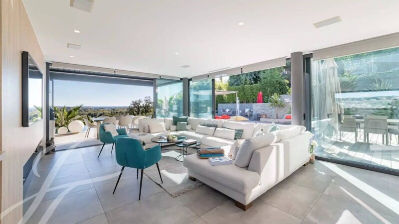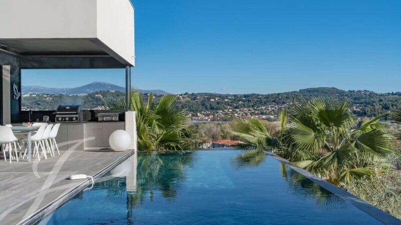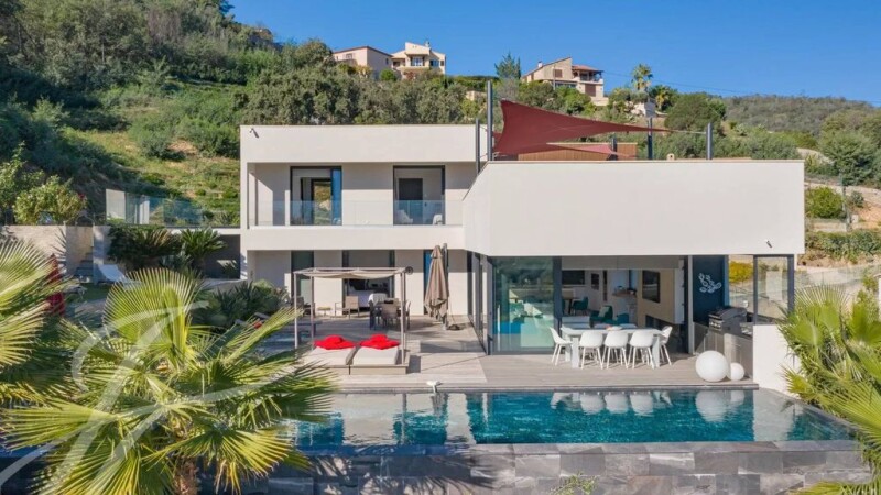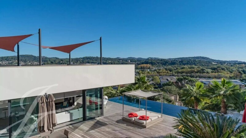 Located 3 km from Cannes-Mandelieu airport, exceptional contemporary villa of 280 sq.m on a 3427 sq.m plot with infinity pool, benefiting from all top-of-the-range amenities. Comprising: First floor: : - Large garage for 2 cars, - Living room with open plan kitchen opening onto a large teck terrace and summer kitchen, - Back kitchen, - Superb 13-metre tiled and heated infinity pool, - Master bedroom with large dressing room, - Wine cellar, - Utility/laundry room. Level +1: - Three bedrooms opening onto a sea-facing terrace, - Bathroom, - Two toilets, - Two en suite bedrooms with private shower rooms. Reinforced concrete construction, integrated reversible air conditioning, gas fireplaces, alarm, video surveillance, landscaped garden with automatic watering system, outdoor lighting, electric gate. A second double garage and two further parking spaces complete this extraordinary property.