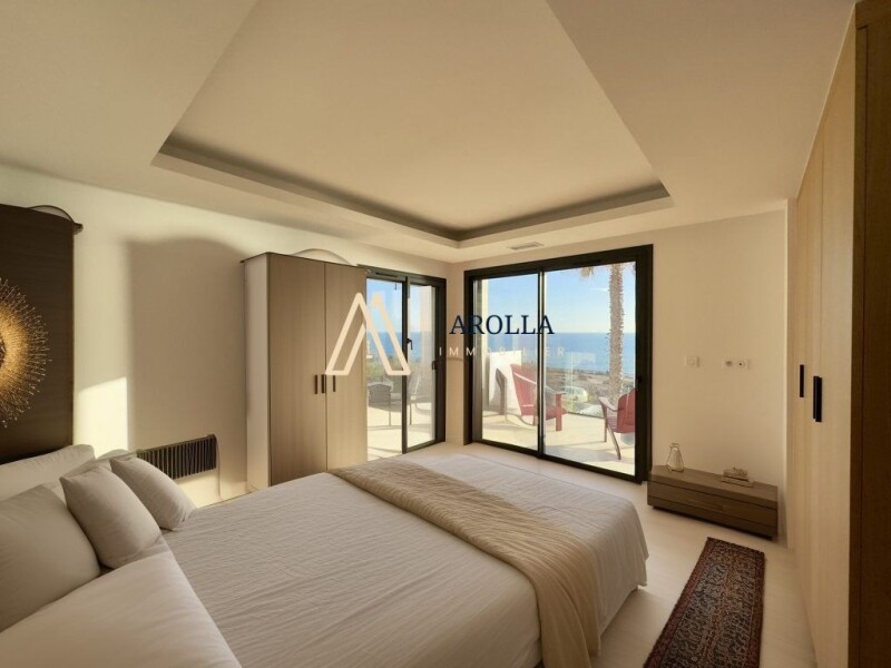 Located on the front line facing the Mediterranean, the Arolla Immobilier agency presents for sale a unique property nestled on the cornice of Sète, offering an idyllic living environment and an exceptional panorama. Entirely renovated with high-quality materials, this exceptional 226 m² villa deploys harmonious and bright spaces, enhanced by a contemporary architecture that fits perfectly into its maritime environment. Upon entering, an elegant hall leads you to a vast living room bathed in natural light and enhanced by a breathtaking panoramic view of the sea. This reception room opens onto a superb terrace where you can enjoy an infinity pool made of Bali stones, with a mirror effect and a submerged beach - a real living picture facing the horizon. The dining room, open to a modern and fully equipped kitchen, combines conviviality and design. This space, designed for comfort and functionality, also benefits from direct access to the outdoors, ideal for relaxing moments with family or friends. A large storeroom with optimized storage completes this part of the villa. Upstairs, a second warm living room, extended by a terrace overlooking the sea, invites you to serenity. The sleeping area offers four spacious bedrooms, each with its own private bathroom and an exceptional view of the sea. Light subtly passes through each room thanks to the latest generation glazing, combining a 180° panorama and absolute privacy. The outdoor spaces compete in charm: three terraces, two of which are shaded by trees, a carefully landscaped garden and a pétanque court invite you to relax and enjoy outdoor leisure activities. Every corner of the property has been designed to enhance your daily life. In addition to its high-end services, this villa benefits from an ideal location with easy access to all amenities: beach, shops, schools and services are nearby. In addition, a bus line directly serves the private driveway of the house, offering a practical solution for your travels and reinforcing the comfort of life offered by this property. On the practical side, this villa meets all your expectations: a technical room for the swimming pool, a space dedicated to bicycles and secure private parking complete this exceptional property. This villa is much more than a house: it is an invitation to a peaceful and refined life, in perfect communion with the sea and the surrounding nature. Do not miss the opportunity to acquire this rare gem on the market. Contact the Arolla Immobilier agency today to organize a visit and let yourself be seduced by this oasis of tranquility. Your new life begins here. Photos on request. **************** Located front-line facing the Mediterranean Sea, Arolla Immobilier presents this unique property nestled on the cliffs of Sète, offering an idyllic living environment and exceptional panoramic views. Completely renovated with premium materials, this exceptional villa spans 226 m², featuring harmonious and luminous spaces, enhanced by contemporary architecture that blends seamlessly into its maritime surroundings. Upon entry, a stylish hallway leads to a vast living room flooded with natural light, complemented by a breathtakin...