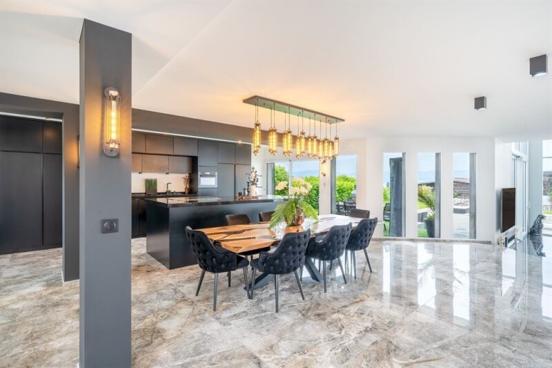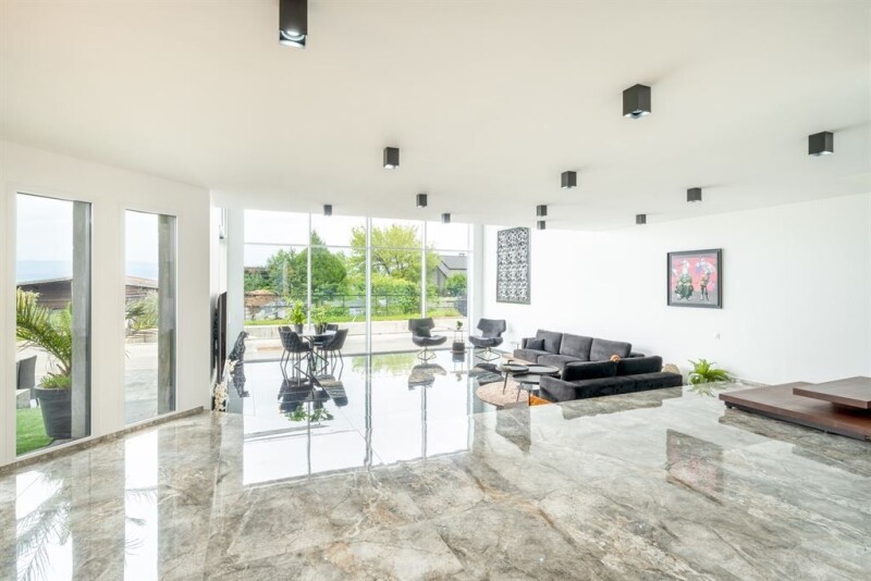 Thonon les Bains, close to schools, the town center in a quiet area, contemporary villa built in 2022, of 450 m2 stood on 1332 m2 of landscaped enclosed grounds. Comprising: entrance with cloakroom/dressing area, fitted kitchen opening onto a large living/dining room with fireplace and terrace/swimming pool access, office space. Upper floor: 2 bedrooms with custom-made storage furniture, bathroom with toilet, suite of 50 m2 with adjoining shower room, dressing room, and access to a large balcony with Jacuzzi. On the lower floor - Large office, bedroom, bathroom and toilet, laundry room, a games room, a room to be finished (sauna possible), a garage for 6 cars. Quality services, heat pump, photovoltaic panels, reinforced insulation. Contact us today to find out more.