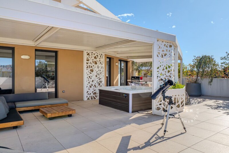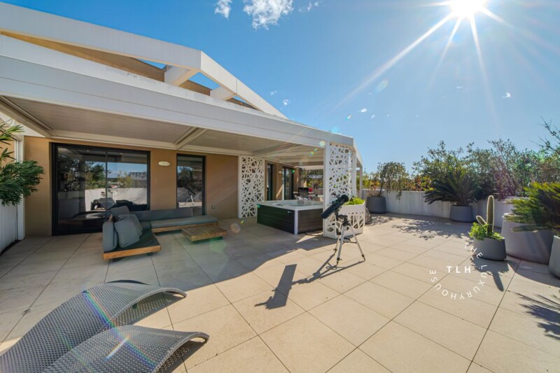 The Luxury House agency presents this superb T5 duplex in Castelanu le Lez, 241m2 with a total of 195m2 of terraces, in a luxury residence. On the ground floor, the apartment offers a large living room with a fully equipped open Miele kitchen, a dining room, a laundry room, a toilet and a master suite with a dressing room and shower room. The living room opens onto the large 108m2 terrace with pergola, jacuzzi and automatic watering. Upstairs, a large room with a billiard table leads to three other suites. Each bedroom has a closet and bathroom. All rooms have a private terrace. The apartment has plenty of closet space. 6 parking spaces are allocated to this apartment, including 3 garages. The apartment is fully air-conditioned. A swimming pool is also available to co-owners. Close to all amenities, 5 minutes walk from the tram and 5 minutes from the highway. Property subject to the legal regime of co-ownership. 98 lots Co-ownership charges: 780? /month No proceedings in progress. Contact Inès MOULIE for more information or to arrange a visit: Inès MOULIE at 06 45 61 24 59 / ines.moulie@tlhimmobilier.com Managing Partner holder of the professional card Transactions on real estate and businesses no CPI34022024000000010 issued by CCI HERAULT, Price including tax, fees included, payable by the seller. Information on the risks to which this property is exposed is available on the Géorisque website: www.georiques.gouv.fr.