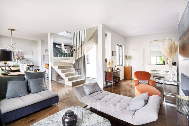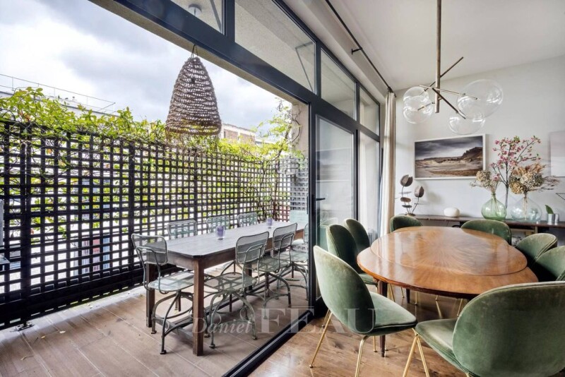 This entirely renovated property is located between the Damrémont and Jules Joffrin neighbourhoods. It includes an entry with a cloakroom, a bedroom opening onto a patio, a utility room, and a near 20 sqm two-room apartment with a living room, an open-plan kitchen, a bedroom and a shower room. upstairs are two further bedrooms with a bathroom, and a master bedroom with a shower room and dressing room. A spacious living/reception room with a fireplace and a kitchen with dining facilities opening onto a terrace are upstairs. The top floor comprises two further bedrooms (one with a shower room), and a wide second terrace. Parking spaces are nearby. With a large basement cellar and technical premises. État des risques et pollution: en cours (null).