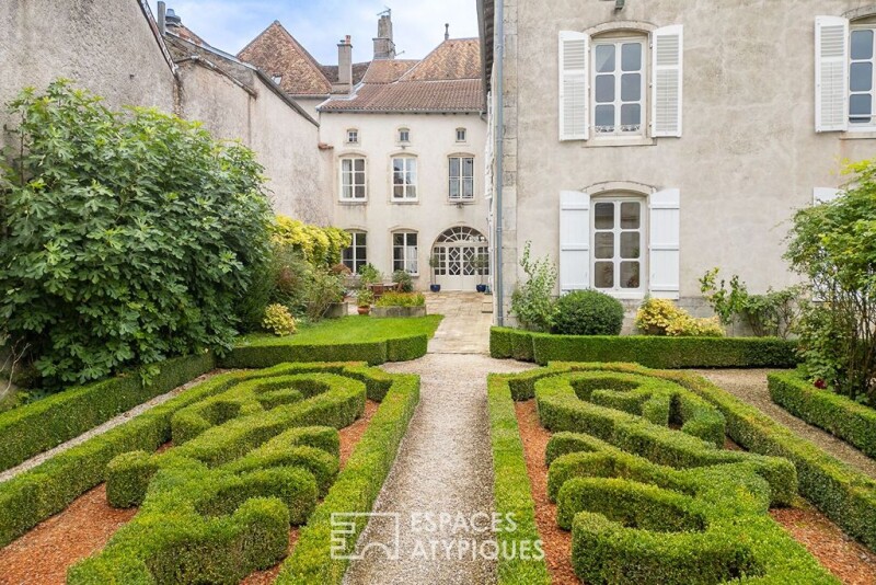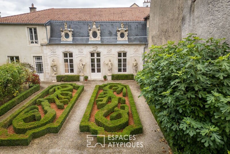 Situated in the heart of a charming town in the western Vosges, this property steeped in history dates back to the 17th century. Nestling behind a facade full of character and finely carved ashlar, it comprises a 450 m² main building and a detached 150 m² pavilion, joined by a superb, perfectly tended formal garden. As soon as you enter, the travertine floors, high ceilings and original woodwork immediately take you back in time. The ground floor features a large living room, a dining room, a boudoir with fireplace, a vast library, a fitted kitchen and a study that can be used as a bedroom with en suite bathroom. Versailles parquet flooring, marble fireplaces and ceilings adorned with mouldings and rosettes all contribute to the refined atmosphere. The grand staircase leads upstairs to three beautiful bedrooms, each with its own bathroom, and two vast rooms, one of which is used as an entertainment room and the other as a bedroom. There is also a separate kitchen on this level. In the attic, the impressive roof structure bears witness to the skills of the craftsmen of the time. Finally, the monumental cellar features pointed vaults over 5 metres high. Outside, the formal garden is a work of art in itself, with its carefully trimmed boxwood beds and white gravel paths. A shady arbour invites you to relax in a timeless setting. The façade of the pavilion also impresses with its many ornaments and its four sculptures symbolising the four seasons. Inside, there is an impressive reception room with high windows overlooking the garden, a kitchen and a shower room. Upstairs are two bedrooms nestling under the roofs. A garage with space for four cars completes this property, which is ideally located in a peaceful setting close to all amenities. This unique residence, both a historic monument and a haven of peace, bears witness to an exceptional literary and artistic past, while offering a timeless atmosphere imbued with elegance and serenity. Listed as a Historic Monument Not eligible for ECD Contact : Valentine 06.63.32.39.79.
