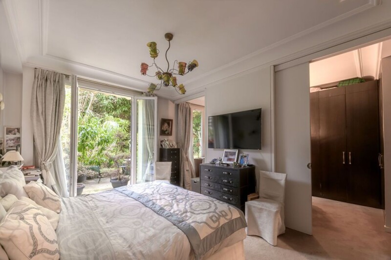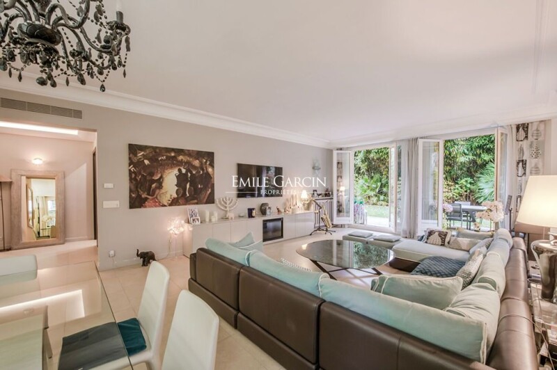 Neuilly-Sur-Seine - Saint-James. Dans un immeuble de standing sécurisé avec gardien, cet appartement en rez-de-jardin offre une superficie de 110 m² et s'ouvre sur un jardin arboré de 200 m² sans vis-à-vis avec accès privatif. Il se compose d'une entrée, d'une cuisine dinatoire équipée, d'un grand double séjour lumineux avec home cinéma donnant sur le jardin, de deux chambres, de toilettes invités avec lave-mains, ainsi que d'une grande salle de bains avec douche et baignoire. L'appartement bénéficie d'une belle hauteur sous plafond, il est climatisé et exposé sud-est. La configuration actuelle permet la création d'une troisième chambre, selon les besoins. Une cave et un emplacement de parking en sous-sol complètent ce bien. Condominiums of 7 units ().