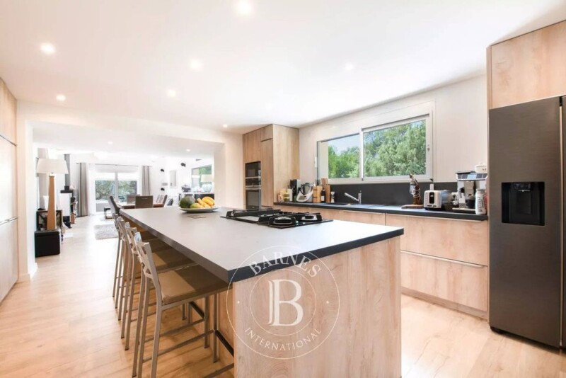 Neo-Provencal villa in the La Bouverie district, entirely renovated by a renowned architect in Sainte-Maxime. Built on two levels, it comprises : First floor: entrance hall, large living/dining room with fireplace, open-plan fitted kitchen, utility room, laundry room, 2 bedrooms, bathroom and shower room with toilet. On the garden level, a second living space with a large living room, 1 open-plan fitted kitchen, three bedrooms, a bathroom, a shower room, a laundry room and a cellar, as well as plenty of storage space. It features large terraces, a swimming pool and a garage, all with an unobstructed view of the Rocher de Roquebrune. In excellent condition, no work required. Agency fees payable by vendor - Franck RENAUX-MOULY - Agent commercial - EI - RSAC.