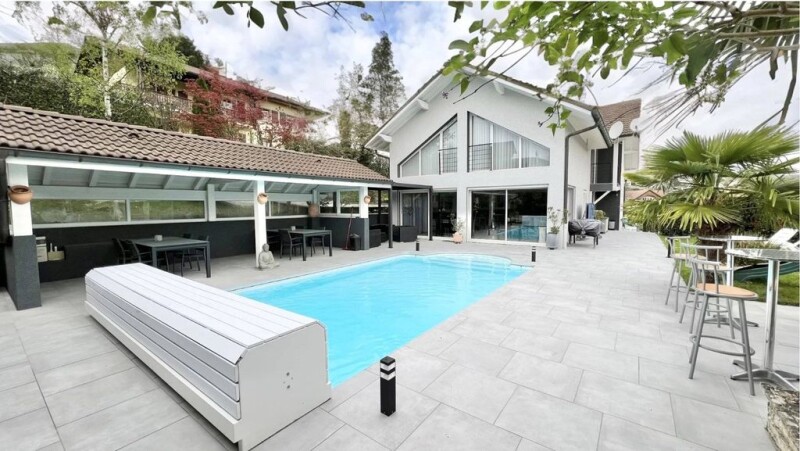 Exclusive, 10 minutes from Annecy, close to primary and nursery schools, shops and the centre of Poisy le bas. In a quiet location, superb family home built in 1995 with 6 bedrooms for 220m2 of living space, a superb view of the mountains and a splendid garden featuring a swimming pool (heated and with a cover) with a huge covered pool house, a summer kitchen, a petanque area. On the ground floor, a superb living room of 63m2 with an east/south and west aspect, an open-plan kitchen, an entrance hall and a toilet. On the mezzanine level; a toilet and 2 spacious bedrooms, each with its own shower room. First floor: a study with balcony, two large bedrooms with en-suite shower rooms and a parent's suite of over 30 m2 with dressing room and en-suite shower room. The annexes include a sports room, a laundry room, a small cellar, a garage and a bicycle shed, split level below the kitchen. To discover more contact us today.