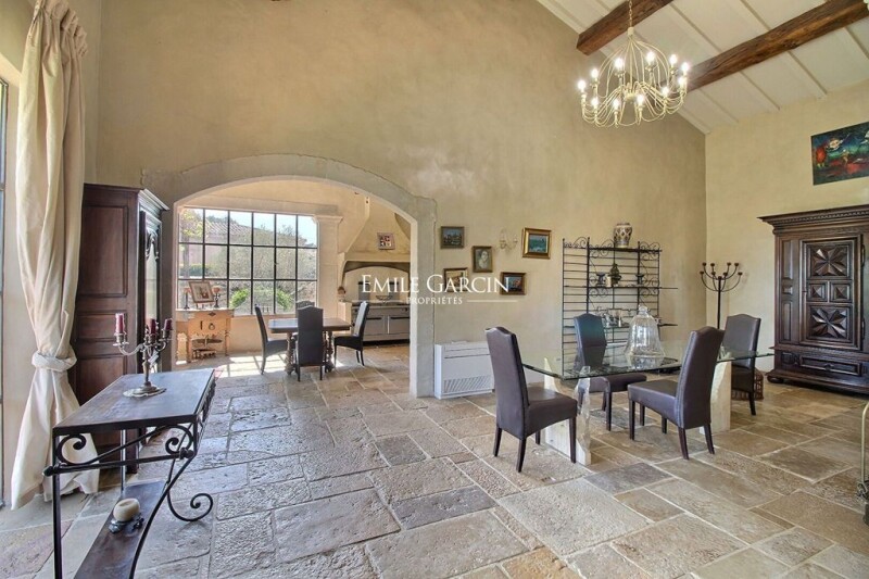 Beautiful stone house idyllically located in the countryside near Saint-Rémy-de-Provence, peaceful and not overlooked. It presents approximately 290 sq.m of living area over two levels, built using high quality construction materials (natural stone paving, large wrought iron windows, old beams, patinas). The spacious reception rooms back onto a terrace and garden. It comprises a dining room, a large living room with high ceiling and fireplace and a typical Provencal kitchen with utility area, as well as six bedrooms, including three at garden level and one in a small adjoining studio. Landscaped garden with swimming pool.