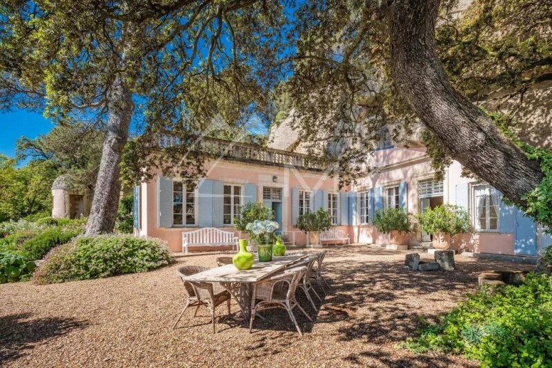 Nestled within the natural beauty of the Alpilles' hills, this elegantly restored 18th-century "Mas" epitomises the essence of Provencal luxury. This remarkable Mas boasts spacious bedrooms, each featuring en-suite facilities, along with expansive living areas. Each of these areas seamlessly connects to the outdoors. Outside, a large swimming pool harmoniously integrates with the lush greenery of the landscaped garden. Adjacent to the pool, a summer lounge, shaded terrace, and a trellis adorned with roses, offer inviting spaces for relaxation and social gatherings. The soothing sound of several fountains and stream enhances the bucolic charm, enveloping the surroundings in a tranquil and romantic atmosphere. Completing the ensemble, a troglodyte guest house (1830) leaning against the cliff offers a fantastic spot with dominant views over the Mas and the olive groves. Additionally, a caretaker's house awaits, providing further accommodation options for guests or staff. Ideally located 10 minutes from Saint Rémy de Provence, this property will appeal to lovers of authenticity.