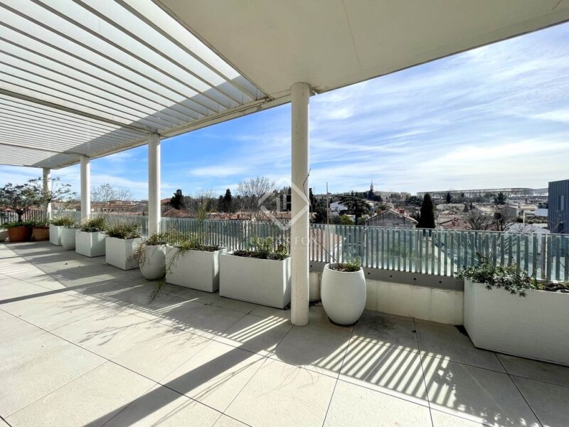 Lucas Fox International Properties, in Les Arceaux de Montpellier, in a recent and luxury residence designed by the famous A+ Architecture firm, top-floor apartment with panoramic views of the city center and its monuments. On the 5th and last floor, penthouse of 185 ² on one level, extended by terraces of 95 m². It consists of an entrance, a triple living room with semi-open kitchen and a back kitchen/laundry room, a dining room, a TV lounge and an office. Night side: 3 bedrooms including a master suite with bathroom and dressing room as well as two bedrooms with shower rooms. All the rooms overlook the terraces which border the apartment and offer a breathtaking view of the Sainte-Anne church, the Palais de Justice, the Jardins du Peyrou and even, on the other side, the famous Pic Saint-Loup. Two underground parking spaces, elevator, common areas with great amenities, disabled access, secure residence with 3 entrances. Close to the Écusson and the Arceaux market. Information on the risks to which this property is exposed is available on the Géorisques website: www.georisques.gouv.fr.
