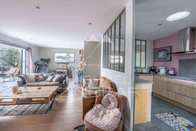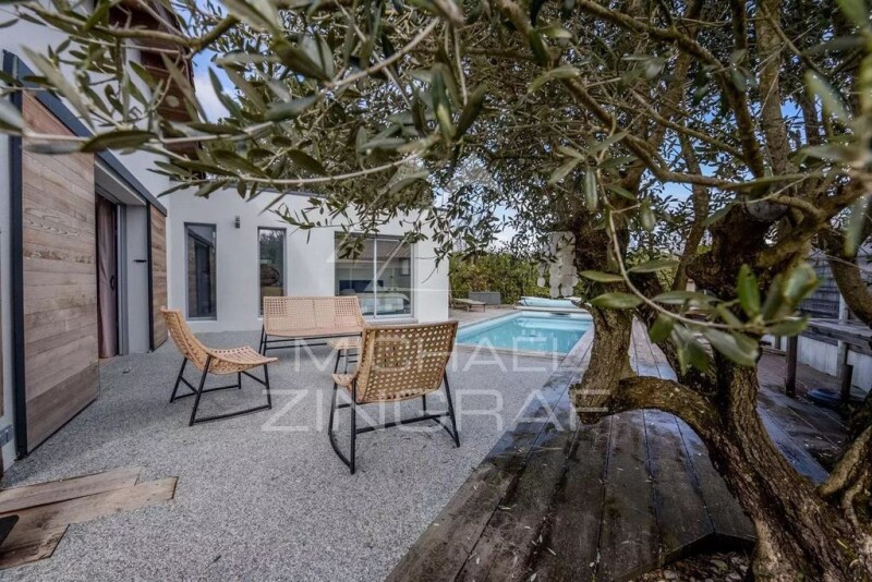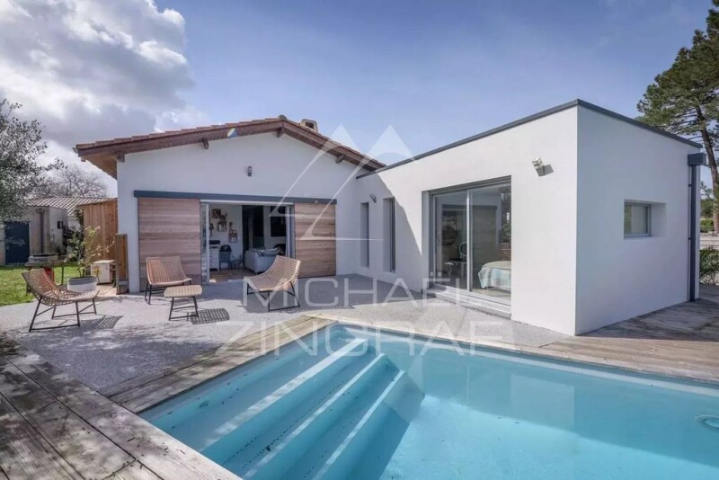 Located in the highly sought-after Musiciens neighborhood in GUJAN MESTRAS, this contemporary residence is a true marvel. Completely renovated with noble and refined materials, the property offers high-end amenities. Built on a 650 m2 plot with triple exposure, it is a true haven of peace. Upon entering, you will be charmed by the built-in closets leading to a spacious, bright living room equipped with a wood stove, overlooking a magnificent pool and a terrace ideal for enjoying sunny days. The fully equipped kitchen opens onto a veranda that serves as a dining room as well as a laundry room. On the other side of the house, there is a master suite with a dressing room and a bathroom, as well as a toilet. A hallway leads to three bedrooms, a bathroom, and a toilet. The garden offers a sunny and private terrace, a heated saltwater pool, a garden, a petanque court, and a parking space. A 35 m2 outbuilding remains to be fitted out according to your tastes and needs. The amenities of this exceptional property are of high quality, such as the AIR AIR heat pump, aluminum double glazing, electric gate, wood fireplace, and air conditioning. In short, this prestigious property in GUJAN MESTRAS is a true work of art, combining elegance, comfort, and refinement, offering exceptional outdoor spaces and high-end amenities that meet the expectations of the most demanding buyers. État des risques et pollution: réalisé (2024-01-19).