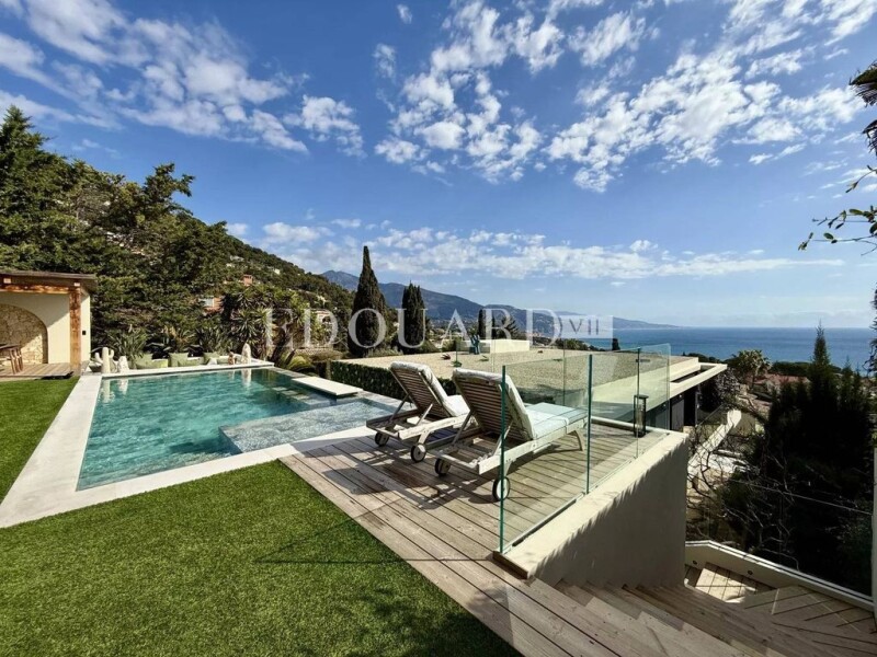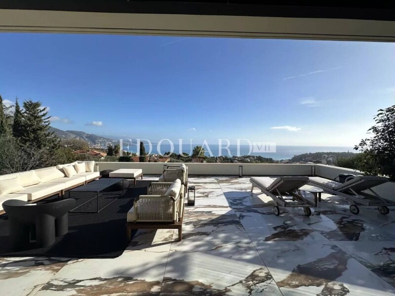 Ideally located in the renowned residential district of Hameau, close to the Principality of Monaco, for sale new villa of 286 sqm spread over three levels served by a lift. South facing and bathed in natural light throughout the day, it offers a superb panoramic view of the sea, the Cap Martin peninsula, the old Menton and the Italian coasts. Completely refurbished and sold furnished, you will be able to settle down immediately, without any additional work required. Main features : - privileged and protected location, surrounded by greenery and calm - stunning view with spectacular sunsets - very bright living room with dining room opening onto a fully equipped open-plan kitchen - 4 en-suite bedrooms, each with its own dressing and private bathroom ; the master bedroom also has a terrace with jacuzzi for moments of absolute relaxation - cinema room - storage intelligently integrated into each room, with tailor-made solutions for optimal organization - ducted air conditioning for high living comfort - huge veranda with double glazing, guaranteeing perfect sound and thermal insulation - great solarium with infinity pool, summer kitchen and brazier, for your evenings with friends - large garage as well as an additional carport.