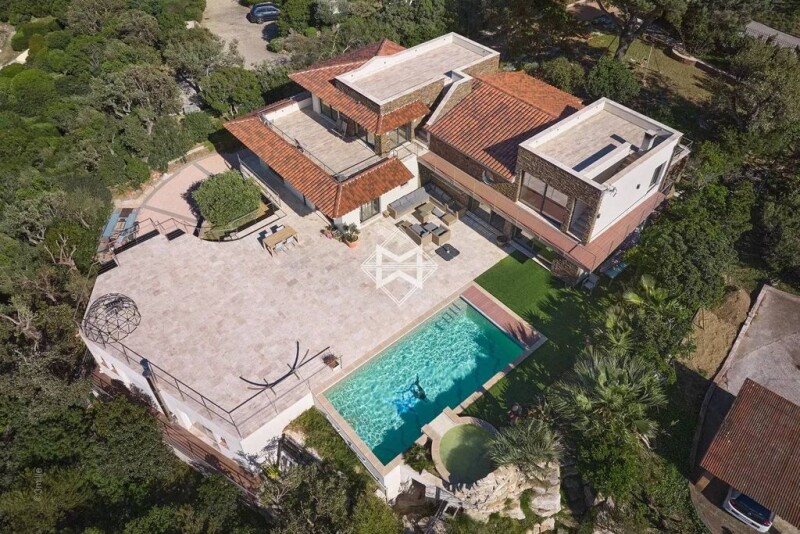 Unique in Cavalaire, this architect-designed villa is close to the city center and beaches in a sought-after domain. On a plot of land of 1500 square meter, it develops 311m2 of living space in beautiful volumes with bright rooms, open to the outside and a cathedral living room with large windows and beautiful ceiling heights, plunging the living spaces into nature. It offers 5 ensuite bedrooms, including a generous parental bedroom, a large living/dining/kitchen area, and a bright and spacious office. Two contemporary rooftop areas with sun loungers and a jacuzzi are accessible, one from the parental bedroom terrace and the other from the office terrace. On the annex surface, there is a 150m2 garage, a lounge, kitchen, dining area, shower room and toilets. The villa provides ample space for entertaining while maintaining an open and spacious atmosphere. A large terrace with views of the hills and sea , presents a beautiful swimming-pool with waterfall and various exotic plants. A picturesque garden precedes the entrance of the villa, and all access points are paved with elegant nighttime lighting. Optic fiber, mains drainage, an alarm system, home automation, automatic irrigation, a petanque area, garage, automatic lighting, and electric gate.