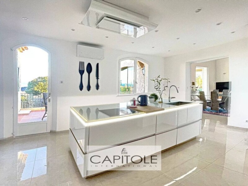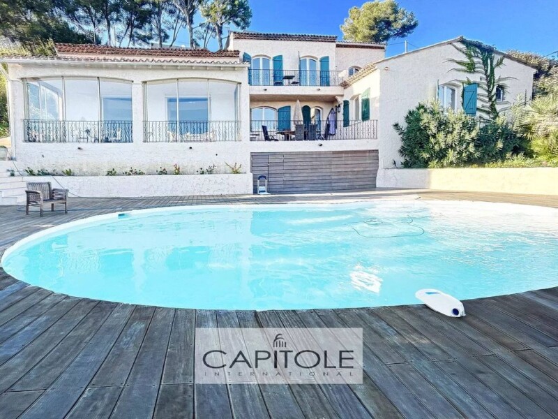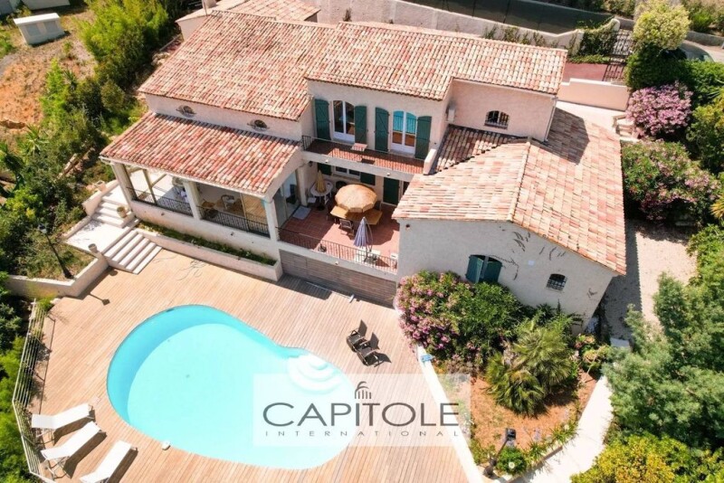 Sea view. 4 bedroom villa of 294 sqm in perfect condition, located in a calm residential area, south facing all on a on a mediterranean garden of approximately 1,500 sqm with a swimmingpool. The villa is as follow, on the first level, an entrance with a study room that opens into a living room, a master bedroom suite with an en-suite bathroom and dressing room. At garden level, a living room with a fireplace, a dining room opening onto a beautiful 24 sqm veranda, a modern fully equipped kitchen, 3 additional good size bedrooms, 2 bathrooms, a sauna, and a laundry room. A double garage and several parking spaces. Hight Quality materials. To be visited without delay. VIDEO ON REQUEST. Ref: CT6037VM.