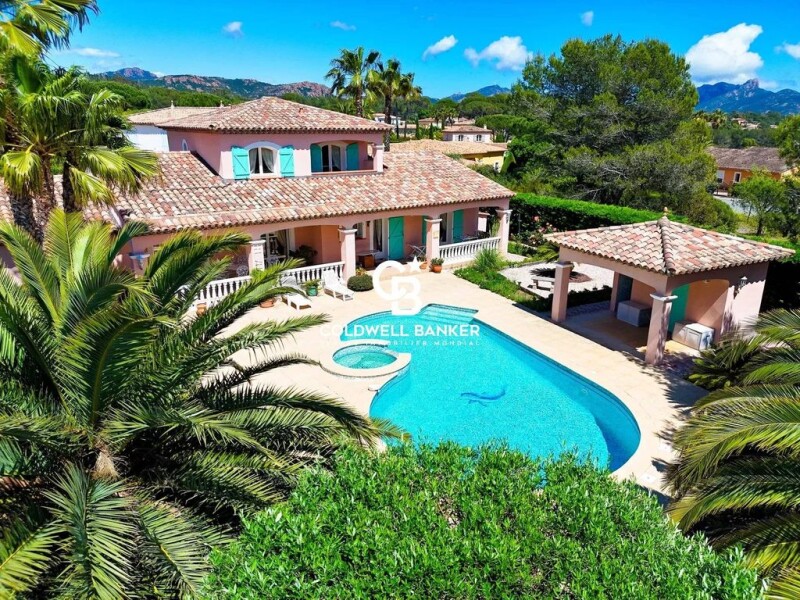Saint-Raphaël, Valescure, a beautiful south facong villa on a garden of more than 1300 m² with a swimming pool. This property was built in 2001. It has a double living room, an independent kitchen, a suite on one level. Everything opens onto a large covered terrace and a garden with swimming pool and pool house. A home office, two other bedrooms, a shower room and two WC are added to the living space. There is also a double garage, an independent studio of 20 m² and an attic. You are about ten minutes on foot from the shops in the area and three minutes by car from the Gulfs of Esterel and Valescure.
