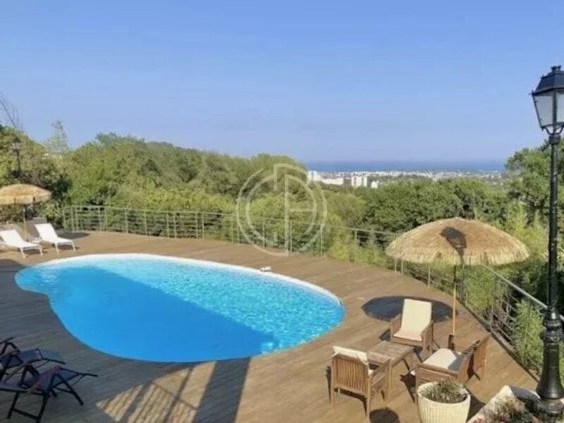 On the heights of Cannes, beautiful 270m2 villa completely renovated in 2022, with breathtaking views of the sea and Cap d'Antibes. Light-filled and open to the outdoors, it features a magnificent mezzanine entrance overlooking the living room, a comfortable master suite with dressing room and balneotherapy bathroom, shower and sea-view balcony. On the ground floor, a vast living space with an elegant fireplace (and heat recovery unit), large bay windows with unobstructed views of Cap d'Antibes, a 24m2 veranda to enjoy the last moments of sunshine.... A beautiful kitchen with central island, giving access to a large terrace facing the pool for al fresco dining, storeroom, laundry room. Three further bedrooms, a bathroom with walk-in shower and another shower room, cupboards or dressing room. An infrared sauna and a large swimming pool with its 150m² exotic wood terrace, a 30m2 double garage with direct access and parking spaces complete this villa. All in comfort and elegance, the renovation has been carried out with quality materials such as large floor tiles in the living room, parquet flooring in the bedrooms, marble finishes in the bathrooms, top-of-the-range kitchen, and air conditioning in every room. Perfectly quiet, don't miss this great investment opportunity on the Côte d'Azur! Information on the risks to which this property is exposed is available at www.georisques.gouv.fr.