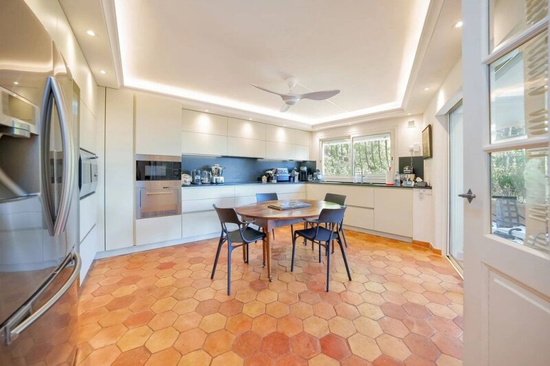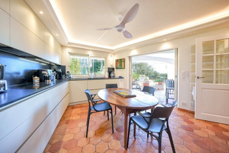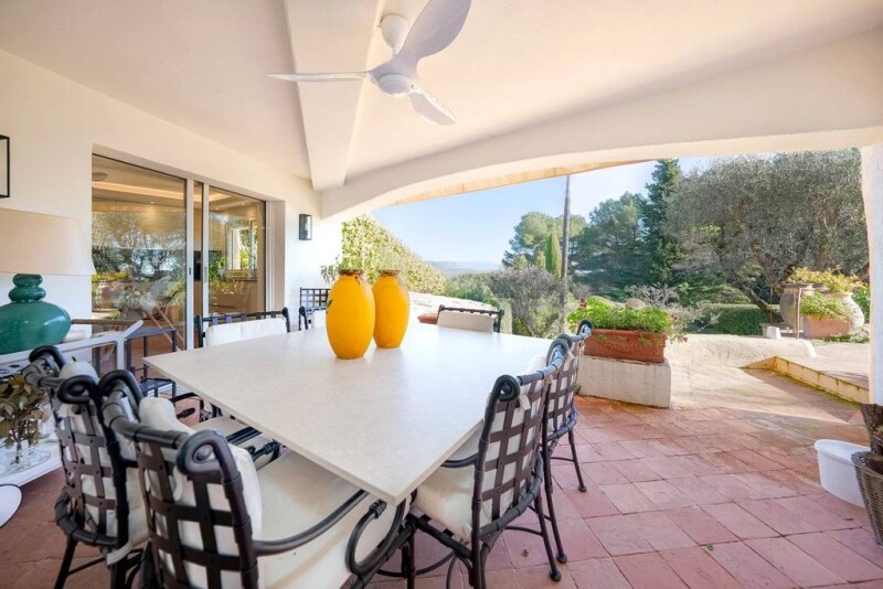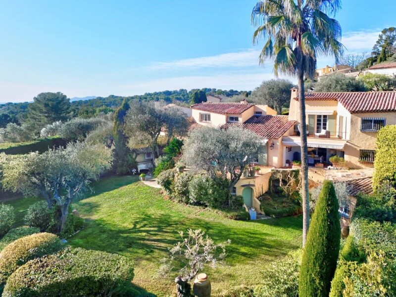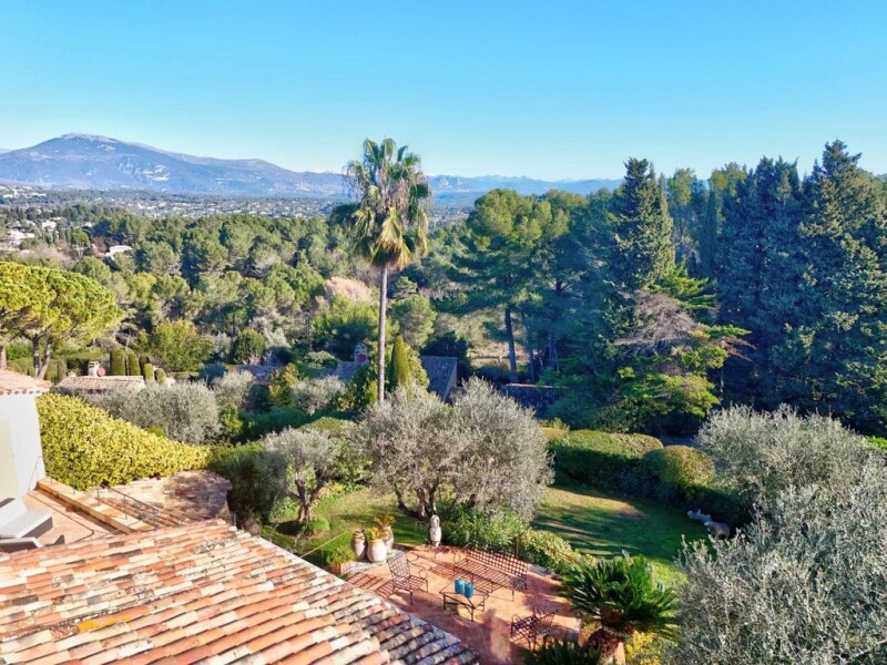 A truly sumptuous villa in Castellaras-le-Vieux, the private hilltop village near Mougins. Castellaras is a truly unique site on the Cote d'Azur, occupying the full crown of a private hill and commanding stunning sea (i.e., the Lerins isles, the Bay of La Napoule, Cap d'Antibes, ..) and mountain views (i.e., the Esterel, the Gorges du Loup, ..). This beautiful Domaine was built in 1957 by famed architect Jacques Couelle (i.e., Cala di Volpi (Porto Cervo, Sardinia), Port la Galere, Le Redon (Mougins), Chateau de Castellaras, .. etc. With 79 residents one co-owns fifteen hectares of old olive groves (permanently protected), a medieval Castle, outbuildings, two mega pools in beautiful settings, four tennis courts, etc. Castellaras offers a super ambience, a mix of residents from all around the World, stunning views in all directions, beautiful and protected surroundings, a super Summer restaurant by the pool or in the cloister, a Club-house offering accommodation in the beautiful Castle rooms for members, 24/24 security, a friendly on-site full services office. The villa is one of the rare double villas, offering more space than the more standard single villas. The villa offers 269.10 m2 of luxurious living space, plus annexes (40 sqm.) Sprawling terraces (137 m2.) ideal for entertaining on a large scale, a beautifully landscaped and totally private flat garden. The villa was beautifully refurbished in 2022 and is in perfect condition throughout. The villa is built primarily on two levels, offers an easy flow, high ceilings throughout and two interior staircases separating two wings allowing for privacy. In total, the villa offers five double suites all with bathrooms en-suite. Main floor: a vast entrance hall with beamed ceilings, a small office (more a technical room), a large living room with a monumental antique stone fireplace, opening onto a sprawling east facing terrace, an open dining area, a new, designer, big family kitchen (both the dining area and kitchen open onto a charming covered terrace ideal for Summer dining) a guest cloakroom and loo, a suite with a full bathroom (and separate shower) en-suite, his & her dressing areas, and a charming private terrace. Also on this level a separate service entrance, a laundry and a staff loo. Upper level : More two separate wings. One wing offers two large suites both with bathrooms en-suite and both enjoying a private terrace commanding long-ranging views. The other wing offers a large suite with a bathroom-en-suite and a cosy sitting room. Lower garden level : separate fifth bedroom with shower room, a large storage room and wine cellar. Misc. exterior lighting, automatic watering throughout, automatic walk-in gate, intercom, gas central heating, automatic shutters, double glazing throughout, roof insulation. Contact us today to find out more.