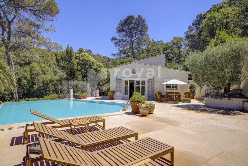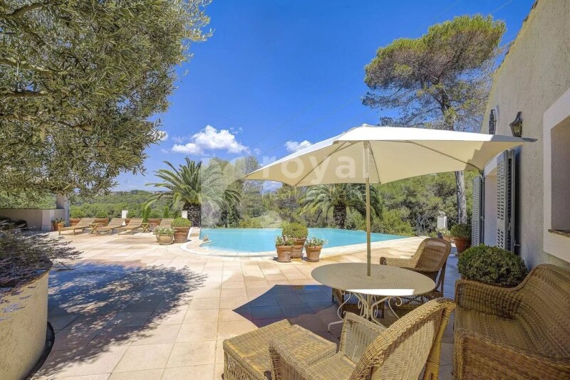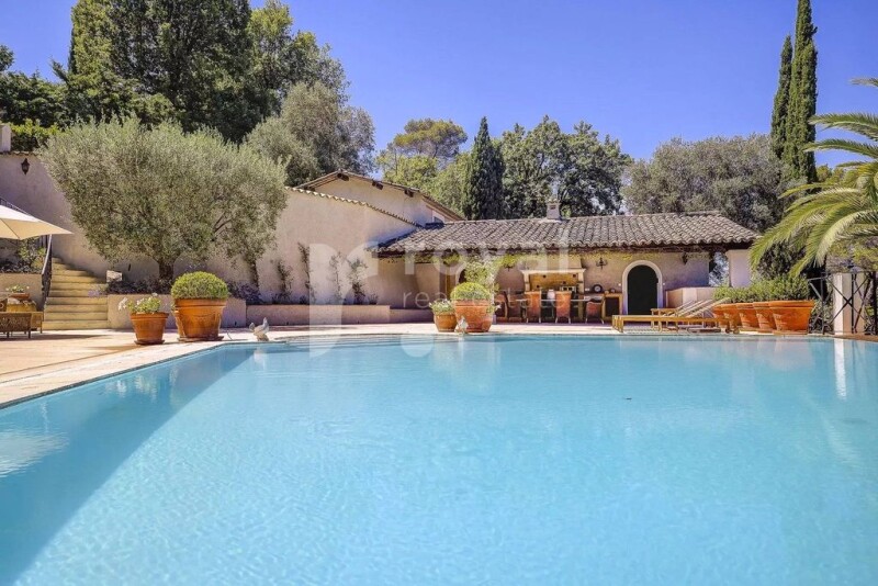 Private property situated on a fenced plot of about 3.5 ha in a closed domain of 4 properties with a panoramic view on the Royal Mougins Golf Club and the hills. The main villa offers: living room with fireplace, dining room, fully equipped kitchen and two guest rooms ensuite. On the first floor: the master bedroom ensuite. The floors are made of Provencal stone. Beautiful terrace with a large swimming pool and pool house with an equipped kitchen and BBQ. An office of 30 m². The guest house, totally renovated in 2008, it offers: a nice living room with open kitchen and 2 bedrooms ensuite. Large terrace with a beautiful view on the golf course. Garden and carport for 2 cars. Garage of 60 m² for 3 cars. The garden of 13665 m2 and the forest of 22316 m2, in private use, with olive trees and old trees favour pleasant walks in the nature. État des risques et pollution: réalisé (null).