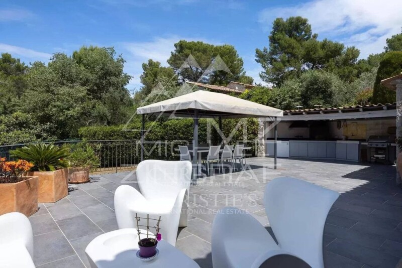 Perfectly exposed villa set on a 1138 sqm plot. It comprises a main house offering, on the ground floor, a "cathedral" living room with fireplace, opening onto a dining room, giving a space of around 42 sqm with light streaming through, with the swimming pool on one side and a welcoming terrace on the other, thanks in particular to a lovely barbecue area. The discovery continues with 2 bedrooms on the ground floor, one with a corner shower, and a bathroom with corner bath (Balnéo). The first floor opens onto a mezzanine room with a study, a dressing room and a bedroom with a Tropézienne terrace. One side of the villa is given over to a flat comprising a living room with kitchen area (23sqm), a bedroom with small anteroom (bunk beds for children) and a shower room. Other facilities include a large laundry room, cellars, a workshop shed and, above all, a heated swimming pool with a beautiful 'beach', which can accommodate the whole family while preserving more intimate spaces. In conclusion: a welcoming place!.