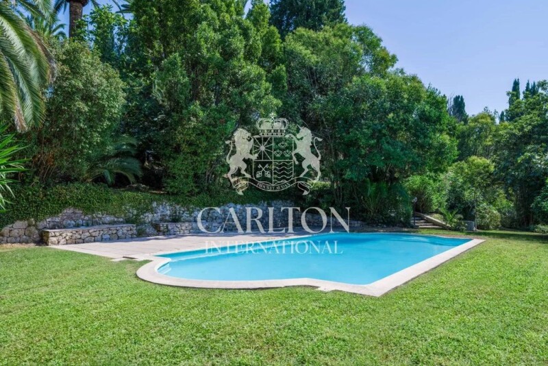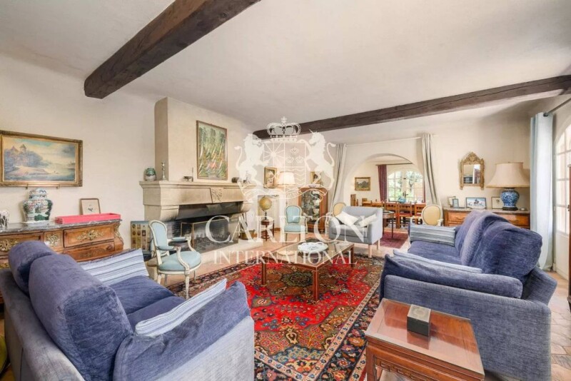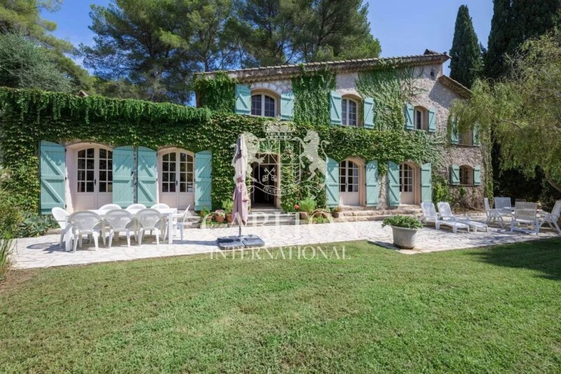 Close to Cannes, international schools and Sophia, in a quiet residential area, in a small closed domain close to a golf course, enjoying a lovely open view of the hills, lots of character for this charming stone country house to renovate. Nice living room with fireplace, dining room, 4 large en-suite bedrooms with bathroom in the main house. Separate adjoining single-storey studio and pool house of 35 m2 with kitchen area and workshop of 40 m2. Very beautiful garden of 6.081 m2 on large terraces with mature trees, superb palm and cypress trees, century-old olive trees, 2 wells with pumps for watering and large 11x6 swimming pool. REF 15377.