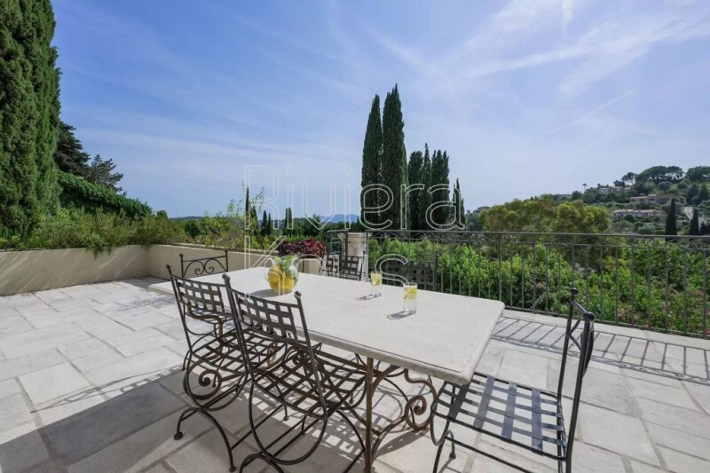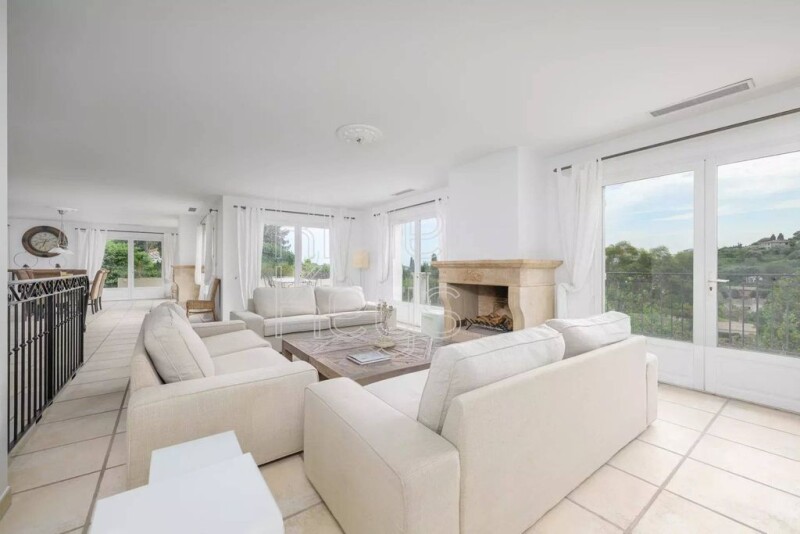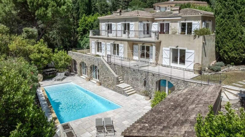 5 bedroom villa in perfect condition, on 3 levels, offering 297 m² of living space. Nestled in a green and peaceful setting, it benefits from a lovely open view of the surrounding hills and absolute calm. On the upper level, a friendly living space with a large bright living room, a 110 m² dining room with fireplace and an open kitchen. Beautiful terraces overlook the garden. The lower level includes 4 spacious en-suite bedrooms and an office. An independent two bedroom appartement is located on the garden level. Well-maintained land of 1720 m², facing south and west, with swimming pool and pool house. A spacious garage. Located just 12 minutes from Cannes by car, this villa offers easy access to international schools and the Valmasque natural park, ensuring an ideal living environment for families or those seeking tranquility. Eva BAQUE +33624368575 État des risques et pollution: réalisé (2022-04-28).