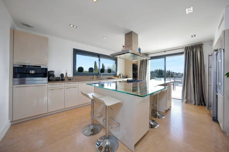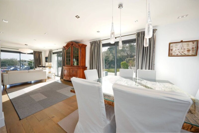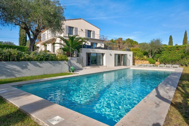 Beautiful, completely renovated villa located in one of the best areas of Mougins within walking distance of the village in a quiet setting with beautiful views towards the village and the sea. Walking distance to the shops. The villa of 280 m2 comprises a large entrance, a fully equipped kitchen opening onto terraces, a large living room with direct access to terraces, TV-room, one bedroom or office, large bedroom with en-suite shower room. Upstairs, one large bedroom with bathroom en-suite and terrace, master bedroom with dressing, bathroom and terrace, bedroom with shower en-suite and terrace. Independent studio, and a hammam with shower room. Basement and large garage. Lovely gardens with a 15x5m heated pool. Air conditioning, alarm and much more, contact us for full details.
