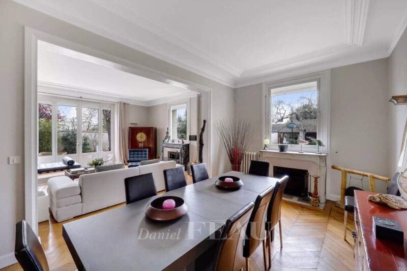 This near 260 sqm early 20th century property set in a peaceful 700 sqm plot is located a stone’s throw from the station and the shops. It includes a spacious entry featuring period floor tiles, a spacious living/reception room and dining room accessing the garden and featuring parquet flooring, mouldings and fireplaces, a kitchen with patio windows accessing a stone-decked terrace and the garden, and a guest wc. Upstairs a wide landing fitted as a sitting room/library leads to a master suite with a bathroom, and a bedroom or study. The top floor comprises three further bedrooms (one very spacious), a bathroom and a wc. Accessed from the kitchen, the entresol has been fitted as a spacious studio apartment with a shower room. With a vaulted cellar and a boiler room. 2 parking spaces. A 2 and 10 minute walk respectively from the station and several schools ((Le Bon Sauveur, Paul Bert, Perceval), and with a bus link accessing the British School of Paris and the Lycée International de Saint-Germain-en-Laye in 40 minutes. État des risques et pollution: réalisé (2023-04-11).