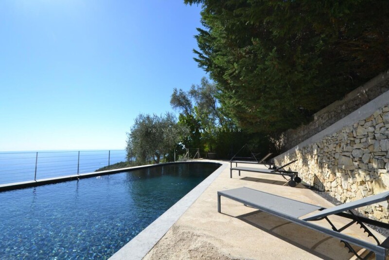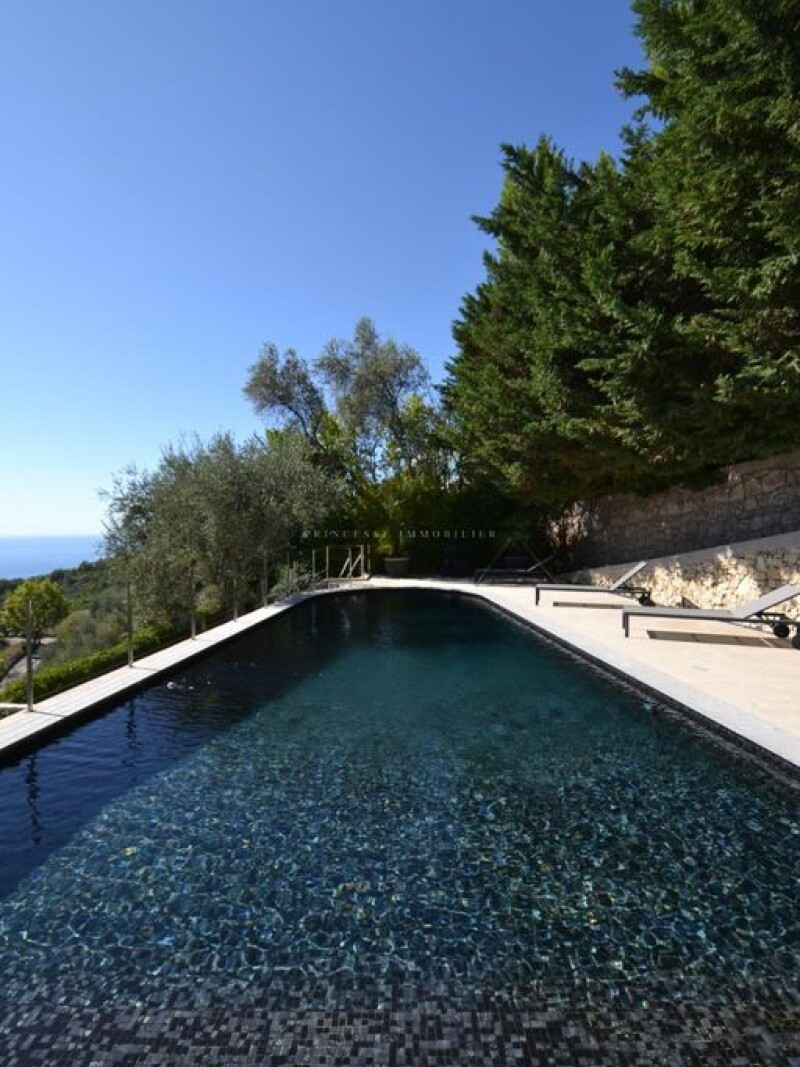 Located above the Moyenne Corniche, with a panoramic view of the sea, just 10 minutes from Monaco, here is a spacious 360m2 villa that we refer to as “the Villa des Amis”! Modern in Provençal style, it stands out for the generosity of its spaces: 150m2 of living spaces in a row, with living room, dining room, kitchen with utility room, spacious covered veranda which can be closed, with a beautiful high ceilings which itself overlooks the swimming pool area (12 x 6 salt water, heated) with its harmonious shape in a cocoon space with views of the sea and the mountains! On the same level, two spacious bedrooms, each with its own private bathroom and en-suite dressing room, and their individual access to a large passageway/terrace shaded by century-old pines. On the lower level, a 50m2 master bedroom with its bath/shower area and a large dressing room, as well as two other bedrooms currently used as storage spaces, and direct access to the garage. A second garage has been built 5 meters from the house, several cars can be parked outside, knowing that the land allows additional parking to be easily created. The volumes in the house, already appreciable, could be sublimated, for example we could open the ceiling of the living room and recover almost 2 m of height under the roof! The villa is well positioned on the top of the land, it is accessed by an easy-to-use ramp which brings elegance. The land is large (3400m2) and beautiful, and has the great advantage of benefiting from a drilling which allows you to have water for watering all year round, hence the quality of the garden, with generous terraces planted with beautiful subjects, notably olive trees. An ideal place to set up children's cabins, or leisure areas (petanque, tennis). That said, the town plan indicates the possibility of building a second house with a surface area of up to 180m2. Interesting potential on the downstream part of the land which also benefits from very beautiful views of the sea and the surrounding landscape. This potential for creating a house for friends, or a house for future resale (the plots are easily detachable) is an added value.