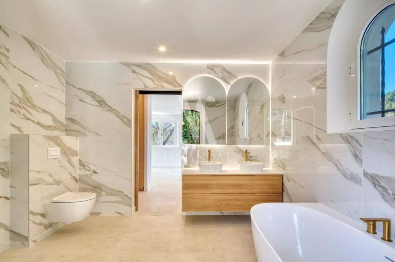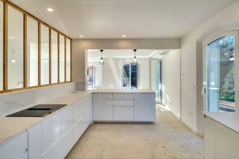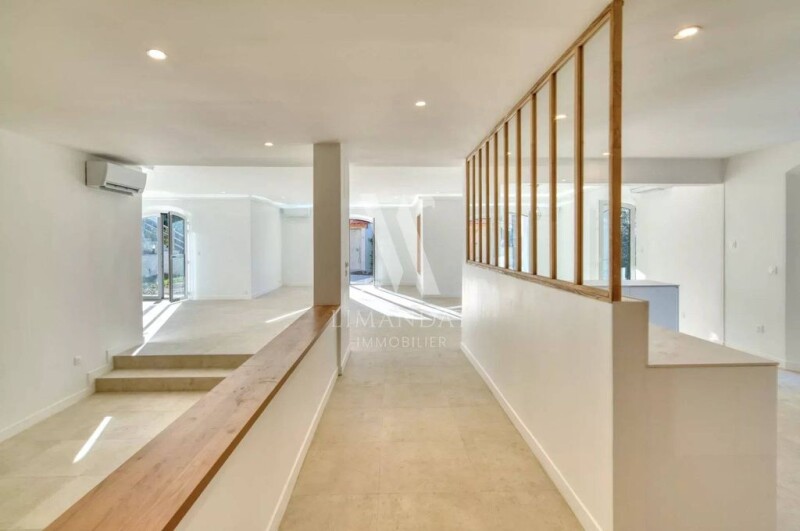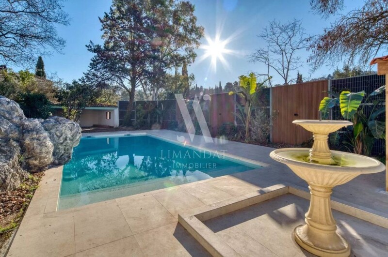 Located in Mougins close to the city center, its shops and the main roads This villa completely renovated with quality materials offers 350 m² of living space and 5 bedrooms all on a beautiful decorated garden At the main level: 1 large covered entrance hall takes you to the main entrance 1 large living room and living room open to the exteriors offer a large and bright living space, with a seating area/fireplace 1 fully equipped open kitchen 1 office 1 bedroom en suite with shower room Upstairs: 1 master bedroom, with dressing room and bathroom all with terrace and garden access, 3 bedrooms en suite 1 laundry room with outdoor access On the lower level 1 cellar The house is surrounded by terraces, 1 swimming pool, 1 pool house, 1 shelter, 1 bowling The land of more than 4000 m² allows you to park many vehicles Fees charged to the seller Information on the risks to which this property is exposed is available on the Géorisques georisques.gouv.fr website.