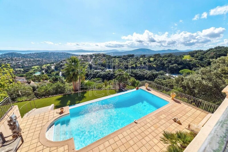 In a peaceful and secure setting, this stunning Provençal villa of approximately 284 m² is ideally located near the golf course and the city center of Sainte-Maxime, offering breathtaking views of the sea and the Gulf of Saint-Tropez. The entrance, on the ground floor, opens onto a large, bright living room with reversible air conditioning, leading to a terrace to enjoy the beautiful panorama. On the same level, the master suite features a walk-in closet and a bathroom, with direct access to the terrace. The fully equipped kitchen, open to the dining room, blends perfectly with the living space. On the garden level, there are 4 other bedrooms with direct access to the garden, allowing easy enjoyment of the infinity pool and outdoor environment. Additionally, there is a shower room, a bathroom, and 2 toilets. For sunny days, a relaxation area with an outdoor kitchen has been set up. The garden is also equipped with lighting and automatic watering systems. An independent living space with a kitchenette and bathroom provides the perfect solution for accommodating guests or staff. A double garage completes this property! Sainte-Maxime, a charming seaside resort located on the French Riviera, enchants with its golden beaches and picturesque streets. Its lively port and charming shops create a vibrant and welcoming atmosphere, while the surrounding nature invites exploration. A perfect place to combine relaxation and discovery. Elisabeth LUTZ +33783647475.