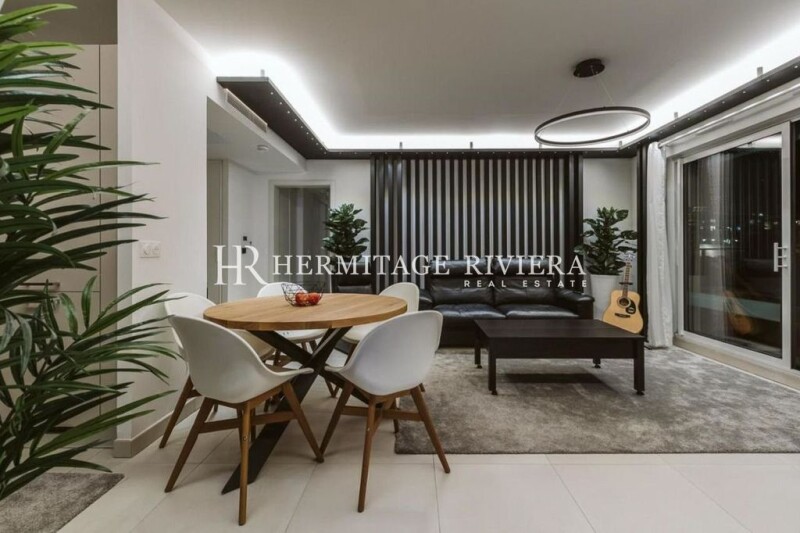 Superb modern apartment in a recent residence calm and close to the frontier with Monaco, offering views of the Principality and Cap Martin. The apartment offers an immense 96sqm terrace with panoramic views, its own jacuzzi, dining area with outside heater and TV. The interior, electronic door front entry with code, a living and dining area open on both sides to the terrace with open-plan fully equipped kitchen, two bedrooms open on the terrace, a bathroom with shower and two washer / dryer machines. In this luxury residence with guardian that dates from 2017 there is a splendid rooftop pool with fantastic views along the coast. The apartment is sold with a cellar. Possible to purchase up to two garages in the residence for €50.000 each.