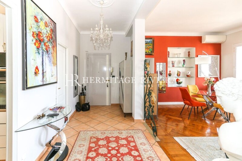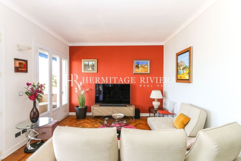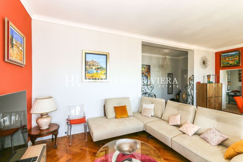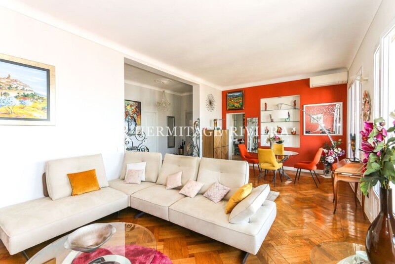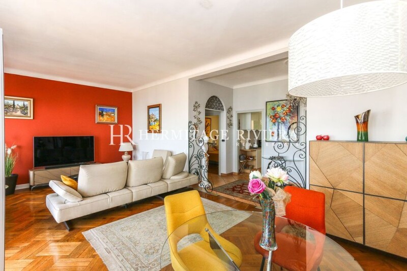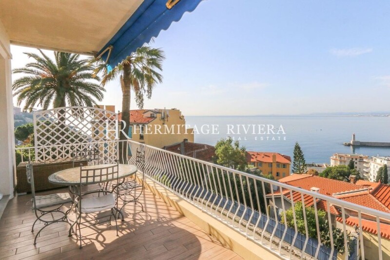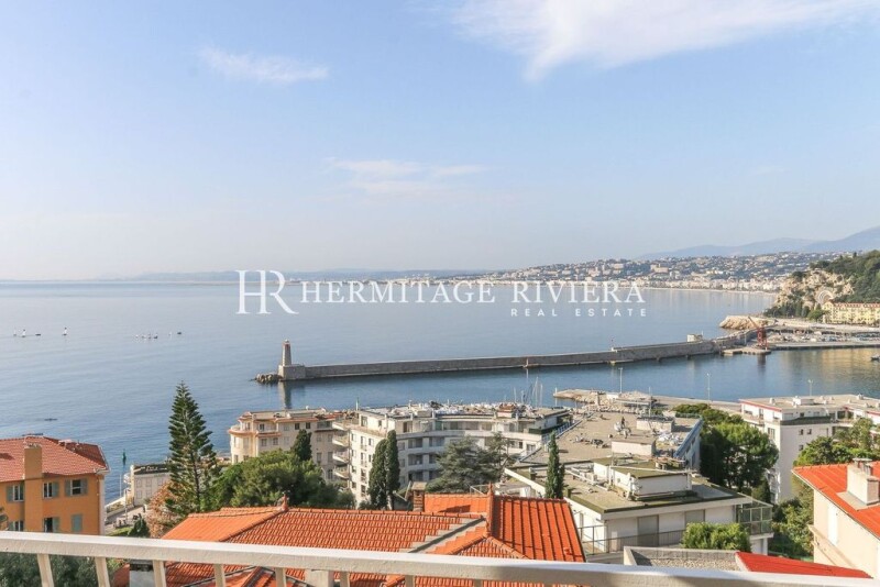 In perfect condition a 3-bedroom apartment enjoying a panoramic view of the sea and the port of Nice. Facing south-west, it consists of a dining room and living room of 43m² opening onto a spacious terrace of 26m², an office, a separate kitchen, three parquet floored bedrooms with storage, a bathroom (shower and bathtub) and a shower room with toilet. Behind the apartment a quiet garden for exclusive use of 150m² with east/south exposure. A cellar. Closed garage possible in addition.