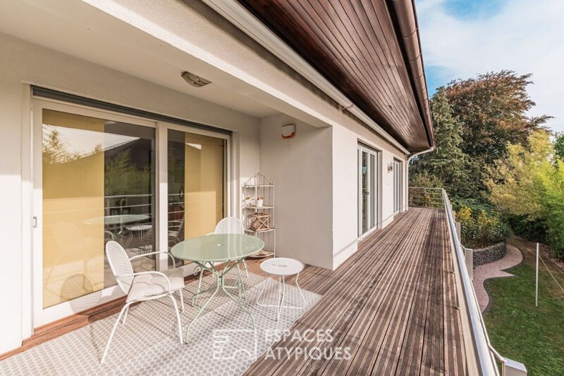 Situated 15 minutes from Strasbourg in a residential area, this family home spans 276 m² of land with a 14-acre swimming pool. In 2020, it benefited from a high-quality contemporary renovation to bring out all the potential of the property. A spacious entrance hall with custom-made storage units and level access to the double garage leads to two levels. The ground floor offers 119 m2 that could easily be converted into an independent flat, offices or even premises for a healthcare professional. It comprises two 22 m2 rooms, a shower room, a fitted kitchen with access to the garden, a single garage and a 25 m2 storage area with built-in cupboards. The upper level is accessed via a beautiful Carrara marble staircase that sets the tone for the living area. This floor, finished to a high standard, offers a generous 156 m2, including a 44 m² living area. Thanks to its large picture windows, the latter enjoys an abundance of light and direct access to a pleasant south-east/south-west-facing IPE terrace. In its extension, several other terraces in a row and a beautiful garden planted with trees, designed by a landscape architect, offer a glimpse of beautiful moments of relaxation out of sight. The separate kitchen is fully equipped and also connects to the main terrace. The night space is served by a corridor with plenty of custom-made storage space. There is a bathroom with shower and bath and three bedrooms, one of which has a private shower room. The house also has attic space that could be converted into additional living space depending on the plans of its future owners. The high quality fixtures and fittings and generous living space are ideal for both a family life and a professional activity, making this a rare property. Three enclosed garages Private parking spaces Net selling price euros1,004,000 Fees of 4.08% payable by the buyer, i.e. euros41,000 ENERGY CLASS: C / CLIMATE CLASS: C Estimated average annual energy costs for standard use, based on energy prices for 2021: between euros2,340 and euros3,320 Contact : Joris 06.70.19.44.25 (4.08 % fees incl. VAT at the buyer's expense.).