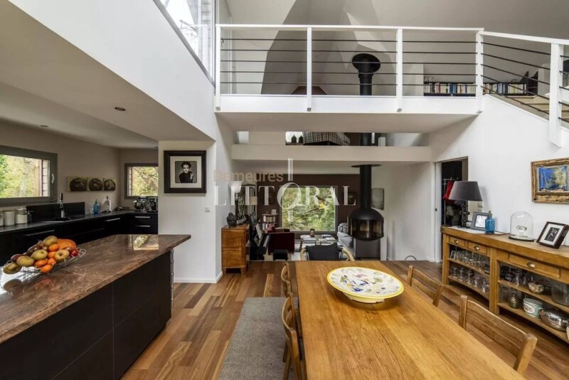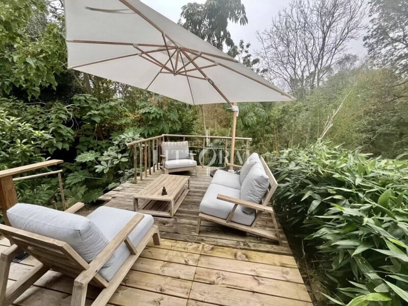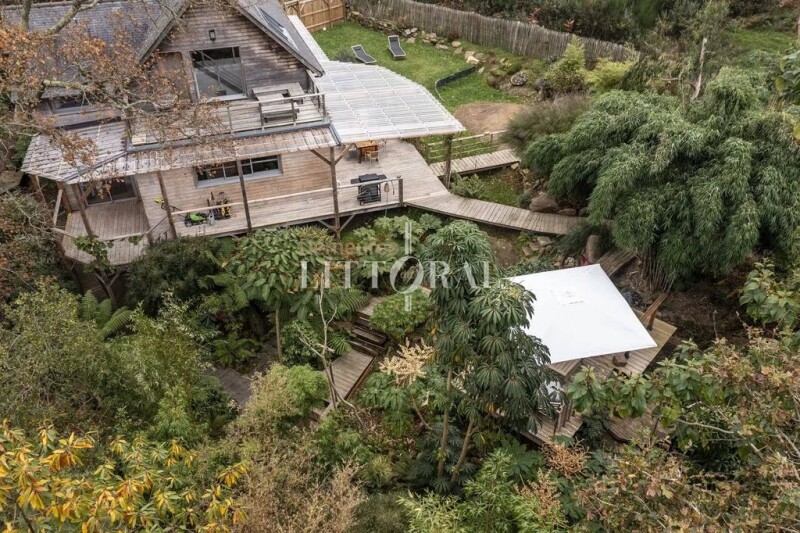 On the Pink Granite Coast, near the Port of Ploumanac'h, Demeures du Littoral presents this property located in an exceptional setting at the edge of the famous Traouïero Valley. This 170 m² wooden house (built in 2010) is in perfect condition and blends harmoniously with the forest atmosphere and its Japanese-inspired garden, offering a serene escape. You’ll be enchanted by the wooden garden terraces, the "zen" pathway winding through bamboo, chestnut, and oak trees, and the tranquil pond. The ground floor features a spacious living area with a wood stove and an open-plan kitchen, a hallway with ample storage leading to 2 bedrooms, a shower room, a separate toilet, and a laundry room. The upper floor invites relaxation with a TV lounge, a wooden terrace, and a private suite (bedroom, shower room, toilet, and walk-in closet). The property's standout features: south-facing orientation, abundant natural light, and breathtaking views. A true gem!.