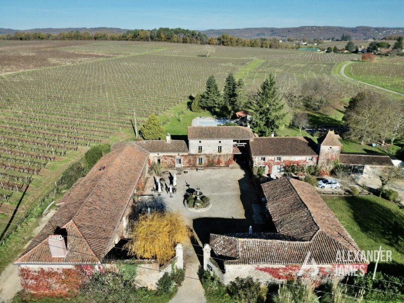 In the heart of the Lot region, amidst the prestigious Cahors vineyards, this unique property is located about 15 minutes from Fumel, with its train station, 40 minutes from Cahors with its many bars, shops and restaurants and approximately 1h40 from Toulouse and its international airport. With its two gîtes, café, and restaurant, this property offers an exceptional setting to immediately start a restaurant business or hospitality activities such as seasonal rentals, seminars, or weddings. The entrance is through a magnificent gate leading to a courtyard with a charming decorative fountain. The left wing of the property consists of a restaurant with a large, fully renovated dining room that has successfully preserved its old-world charm, including a beautiful parquet floor, exposed beams, and a large fireplace. This space can also be converted into a reception room for hosting various events such as weddings or seminars. There is also a large terrace offering beautiful views of the surrounding vineyards. The professional kitchen, fully equipped, is spread over two levels, with a cold storage area in the basement and technical spaces reserved for staff. Adjacent to the restaurant, a cozy gîte features an open kitchen with a stove, a living room, two bedrooms (one upstairs), a bathroom, and a private terrace leading to a heated saltwater pool with a pool house and jacuzzi. A part of the property remains to be renovated, offering expansive spaces to be developed according to your needs. On the other side of the courtyard, a versatile café/bar with WC and a large covered terrace can be used for additional activities. Accessed through a gate from the courtyard, the main house, fully renovated with high-quality materials, includes a bright living room, an office, a fully equipped kitchen, a dining room opening onto a terrace with a summer kitchen, a gym, and an independent studio with a living room/kitchen, a bedroom, and a shower room/WC. Upstairs, the house offers four beautiful bedrooms, including a master suite with a dressing room and en-suite bathroom/shower, and another bedroom with its own en-suite bathroom/shower. The garden, enhanced with Mediterranean plants such as olive trees and oleanders, completes this idyllic setting. Modern heating and air conditioning, along with numerous potential uses, make this property a rare and prestigious opportunity.