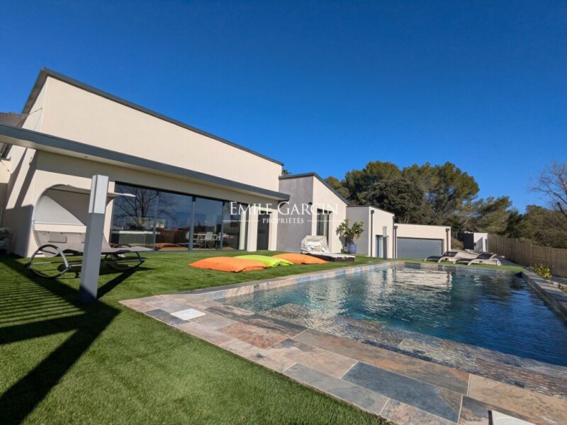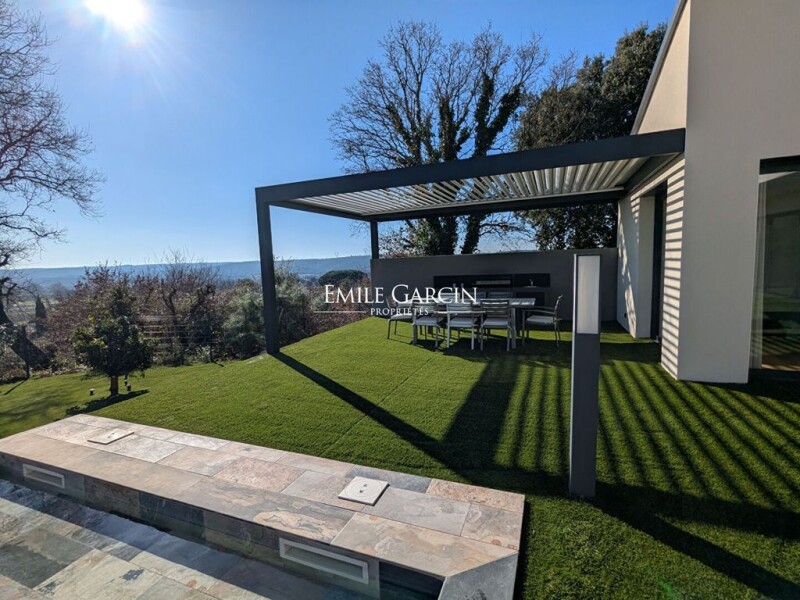 Located on a plot of 1,520 sq.m of private land in a village a few minutes from Uzès, this magnificent contemporary house presents 200 sq.m of living area. Built in 2022 with high-end materials, the property offers a spacious interior including three bedrooms (one of which is ensuite). Additional features include: a swimming pool (11 x 4m) with a bioclimatic pergola and an exceptional view; a gym, which could be converted into a fourth bedroom; a garage (95 sq.m); solar panels and a heat pump.