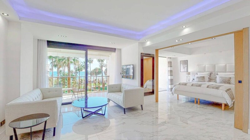 David & Partners presents this exceptionnal seafront and seaview apartment of 135 m2 in Cannes croisette, beautifully renovated with exceptionnal material in the renown residence of 1864 Grand Hotel Cannes. Three gorgeous and bright bedrooms, three bathrooms. Homestaging included in price. Patios, garage & cellar.