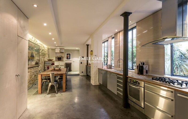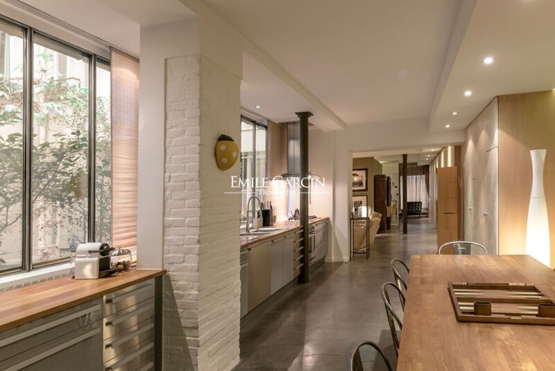 Arts et Métiers - 94.89m² Loi Carrez first floor apartment in a well-maintained building on a quiet street. Generously proportioned, this apartment comprises a dining room and fitted kitchen opening onto the tree-lined inner courtyard thanks to a large glass roof. A living room, a spacious bedroom and a shower room complete this carefully designed space. Cupboards provide ample storage space, as well as an office area. Second bedroom possible. Very good soundproofing and thermal insulation. Bike room and 20 m² cellar. Liberal profession authorized. Ideally located in a low-traffic zone, close to public transport and shops.