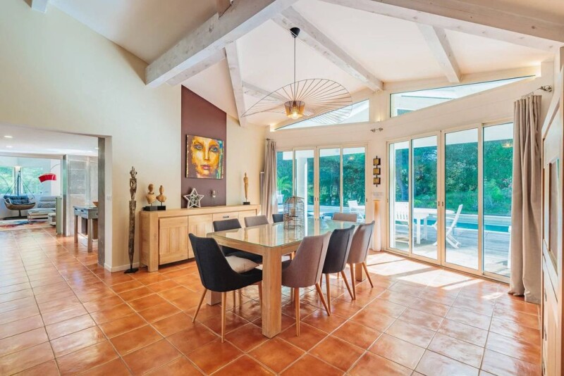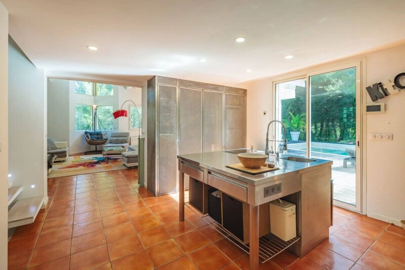 Located in Alleins, 40 minutes from Aix.. In a wooded and quiet setting, discover this architect-designed property combining charm and modernity. Ideally located in a typically Provencal village, it offers a peaceful living environment while being close to all amenities. The main house consists of a large bright living room with a fireplace, two fully equipped kitchens, a dining room, a spacious parental area, an office, as well as a second suite upstairs. The independent guest accommodation has a living room with kitchen, a bedroom and a bathroom, ideal for welcoming guests or for generating additional income by renting it seasonally. Outside, a vast garden with trees and a sunny swimming pool invites chilling and conviviality. Furnished relaxation areas allow you to fully enjoy the mild Provencal climate.