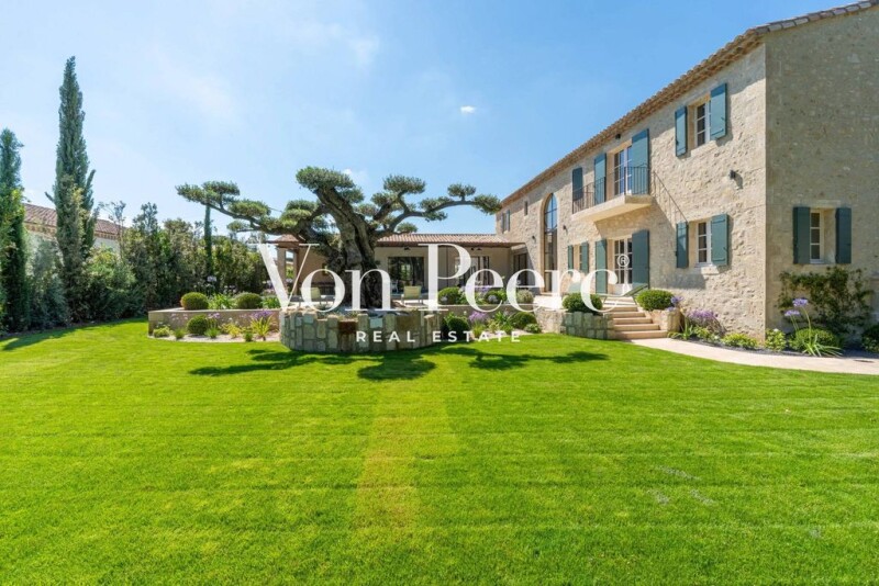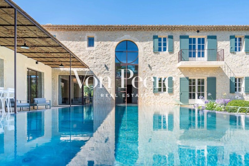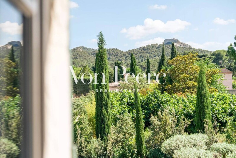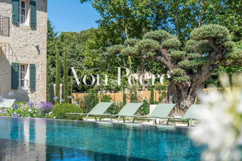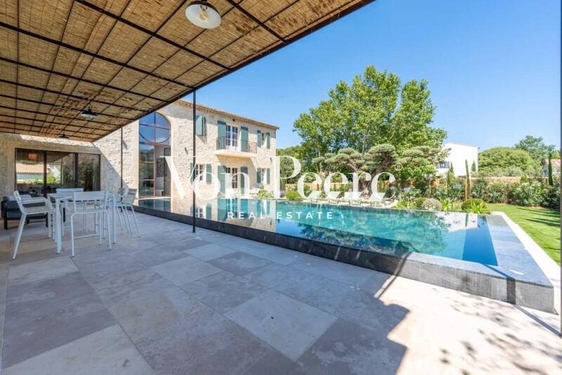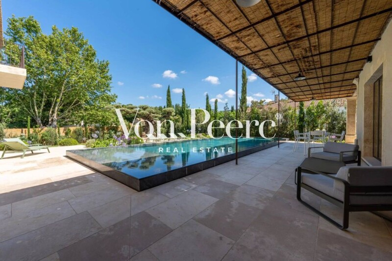 Located in a sought-after residential area of Saint Rémy de Provence, this magnificent house offers a very lovely view of the Alpilles. This contemporary Provençal farmhouse, with a living area of 337 m², is situated on a 1625 m² plot, just 700 meters from the village center. Main features: A majestic entrance with impressive ceiling height and a beautiful view of the garden and the mirror pool. A spacious living room of nearly 60 m² with a stone fireplace. A large kitchen-dining room of 45 m², accompanied by a pantry/spacious laundry room of 21 m². On the ground floor, a large bedroom with a walk-in closet, bathroom, and office. Upstairs, accessible by a stone staircase, 4 en-suite bedrooms, each with a walk-in closet, bathroom, and toilet. Outdoors: Superb tiled mirror pool of 13 x 5 meters, heated with an integrated rolling cover. Numerous terraces and a pool house of almost 30 m². Several parking spaces and a secure, enclosed garage. Beautifully landscaped garden, fully lit, with automatic watering and a pétanque court. Comfort and Security: Heating by ducted hot/cold heat pump. Videophone, intercom, electric gate. This house is sold furnished with reduced registration fees. Information on the risks to which this property is exposed is available on the Géorisques website: www.georisques.gouv.fr.