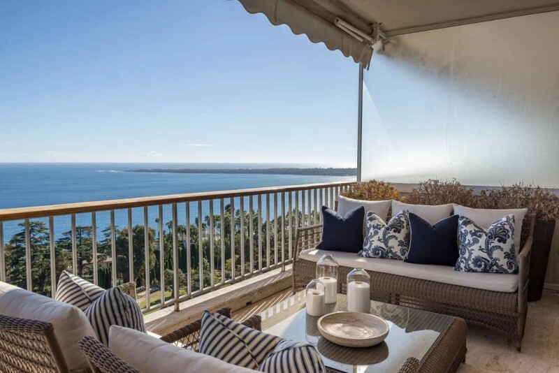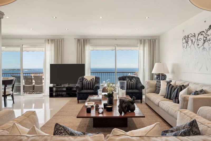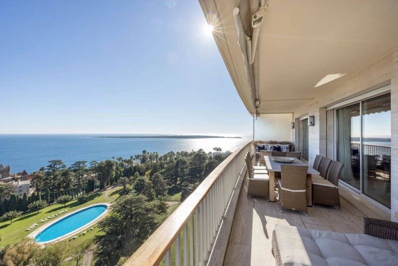 This prestigious residence offers many advantages, such as security provided by a guard, a lush park, a large swimming pool, a fully-equipped gym, and even a shuttle service to facilitate transportation. The contemporary corner apartment, with approximately 125 m2 of living space, boasts beautiful modern features, including a separate, highly modern equipped kitchen and a spacious corner terrace offering panoramic views of the sea, islands, and the Mediterranean. It also features 2 bedrooms, 2 bathrooms, 1 office, and is filled with natural light. In addition to the main apartment, there is a complementary 35 m2 apartment in the basement, a 12 m2 studio, a cellar, and a garage. Furthermore, the apartment is sold furnished with high-value Ralph Lauren furniture, providing unparalleled comfort for living. Contact us today to discover more.
