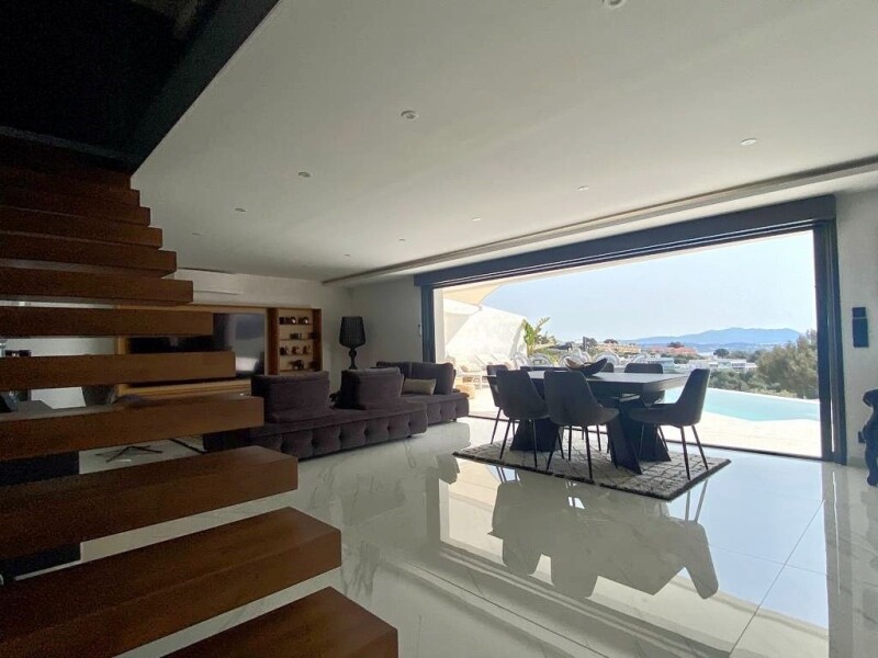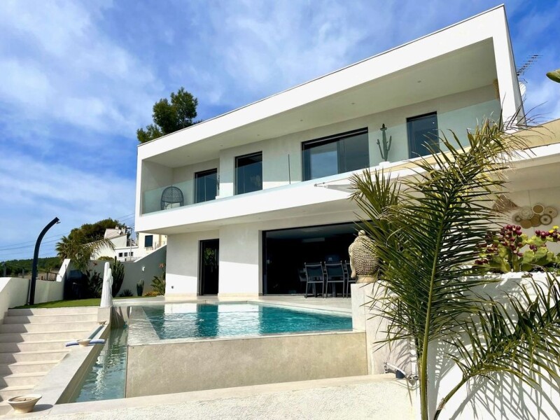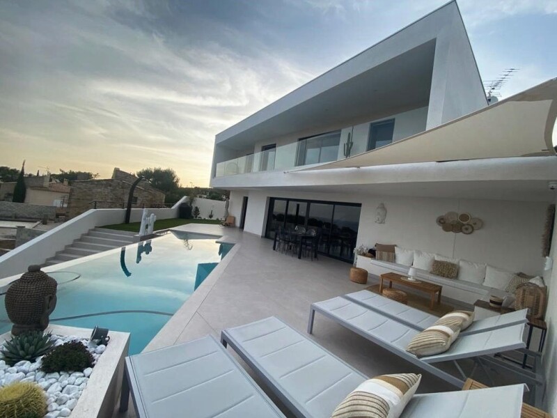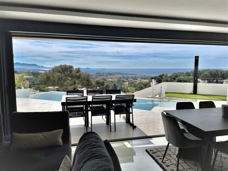 Certainly one of the most beautiful views in Bandol! Located within a 10 minute walking distance from the port and the beaches of Bandol, and 5 minutes from the motorway access, stunning contemporary villa built in 2021, in a quiet sought after residential setting, south facing, offering a 180 degree panoramic view out to sea, the bays of Bandol and Sanary, as well as on the Paul Ricard islands. As soon as you enter the living room, you are immediately drawn out towards the amazing views of the Azur blue of the Mediterranean. On the ground floor: A living space of about 70 m2 with an open plan kitchen opening onto a large terrace with an infinity pool. On the same level: a bedroom with bathroom, an office, a storeroom. On the first floor: a master suite with shower room and dressing room, two bedrooms with cupboards and a shower room. Each bedroom has a sea view and opens onto a large terrace/solarium. Three parking spaces, two of which are under a carport, and a cellar complete this exceptional property. Quality construction. Top of the range services and finishes: sliding doors, reversible air conditioning, home automation, alarms, cameras... To discover more contact us today.