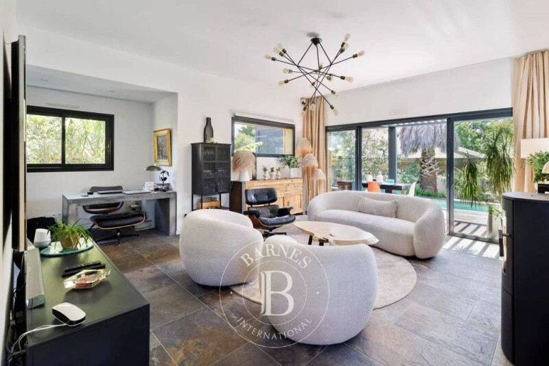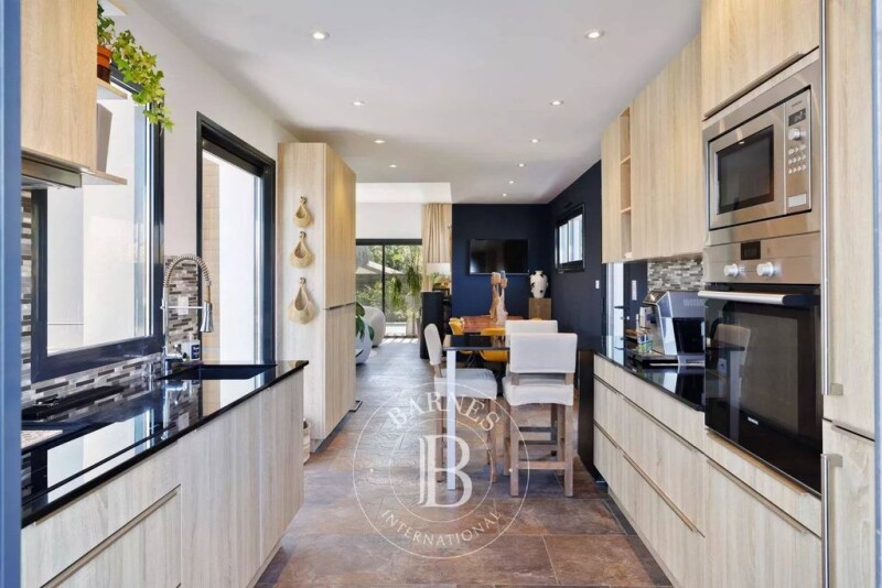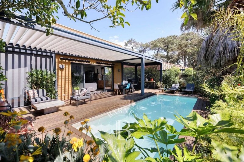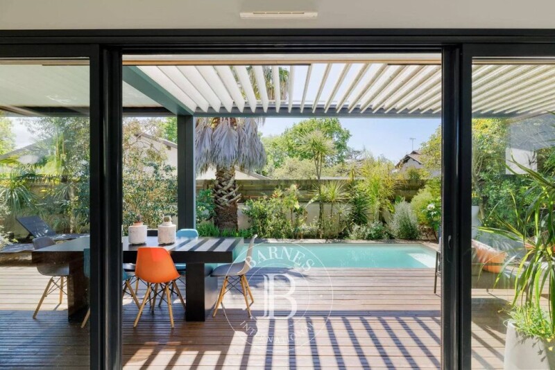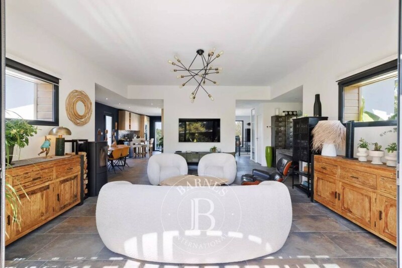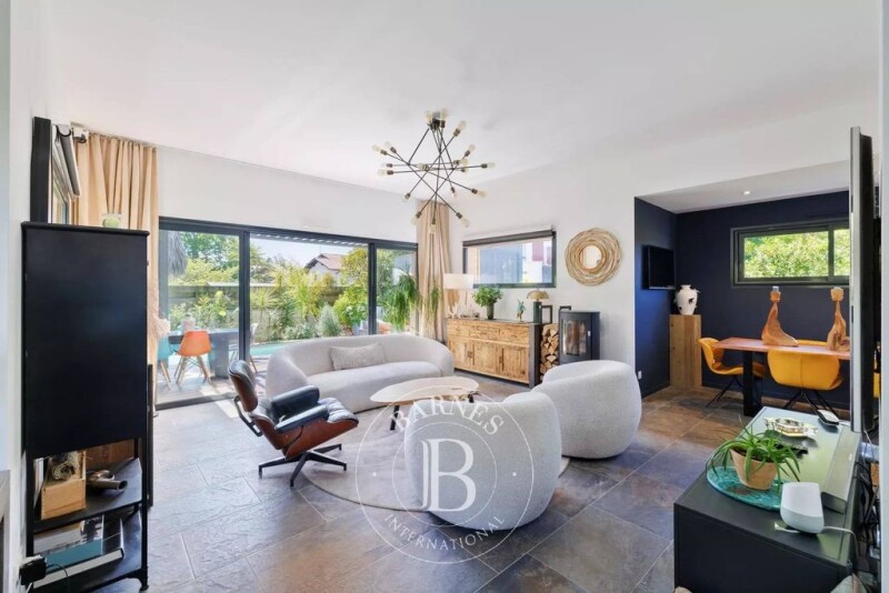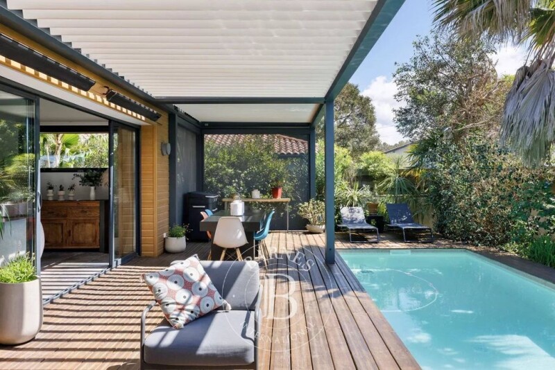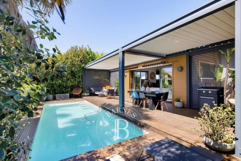 In a peaceful neighborhood, close to golf course, pretty architect house of about 135 m² with swimming pool. It features an entrance, a living room with a stove opening onto the south-facing terrace with bioclimatic pergola, a dining room and a kitchen opening onto another terrace. On the ground floor, a master suite with dressing room and bathroom, two bedrooms sharing a shower room. The house is very bright thanks to its many openings. heated pool, garage.