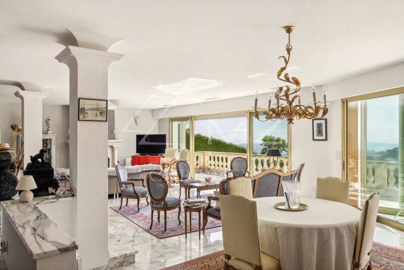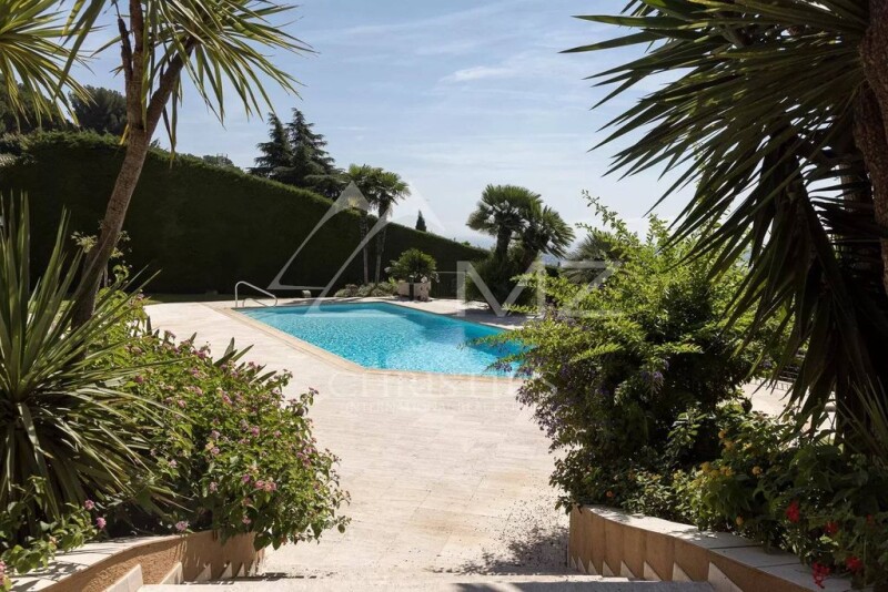 This elegant neo-Provençal style villa, nearly 400 sqm in size, is located in the sought-after district of Vallauris, offering a panoramic and stunning sea view of the Mediterranean and Cap d'Antibes. Set on a wooded plot of approximately 2 100 sqm, it comprises 10 rooms, including 6 bright bedrooms, an office, a separate apartment ideal for guests, and a spacious 80 sqm living room with a fireplace. The villa also features a swimming pool with a sunny terrace, and a garage for two vehicles. The immediate proximity to all amenities (schools, shops, transportation) makes it an ideal place to live for holidays or year-round.