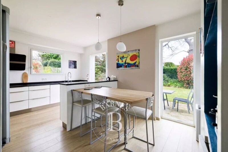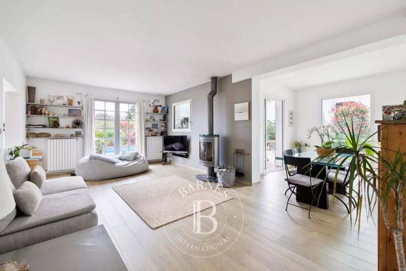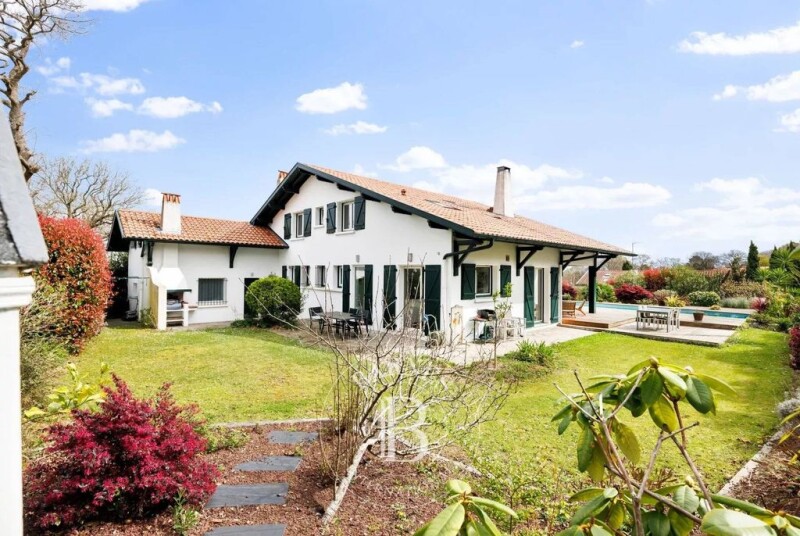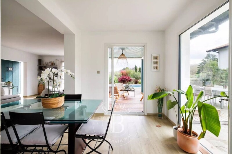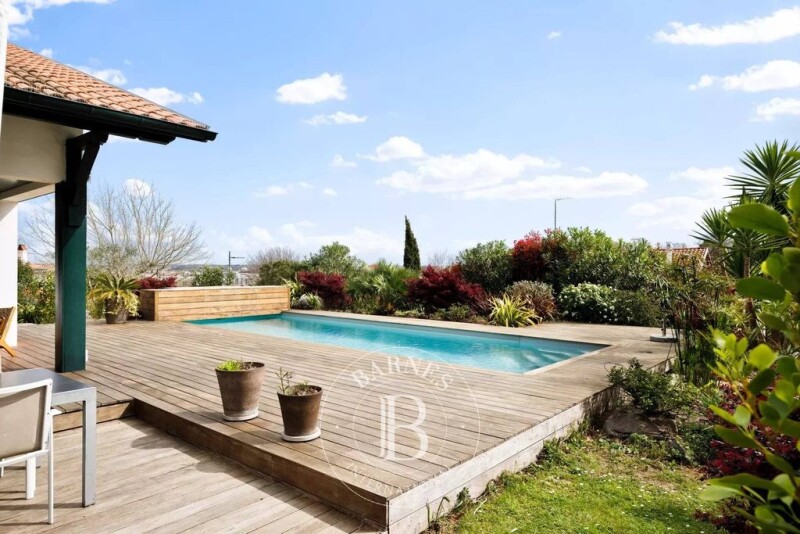 Anglet, close to the town center and city hall, in a perfectly quiet residential neighborhood, bright south-facing house of approximately 235 m² on a lush 1,110 m² plot with a swimming pool. The house offers spacious living areas, 5 bedrooms, 4 bathrooms, an office, an independent studio, a garage, and storage space.