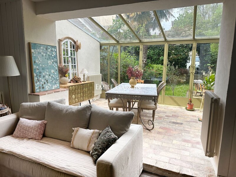 Located in Marly le Roi, this charming house presents approximately 180 sq.m of living area spread over three levels. Located in peaceful green surroundings in the historic centre of the village, near the Royal Park, it also offers a south-facing garden and a paved courtyard for parking. It comprises an entrance, a library/music room, a vaulted cellar, a laundry room, a bedroom with shower room and WC. On the ground floor, you will find a fitted kitchen, a games room or master bedroom with bathroom, a WC, and a living/dining room with a wood burner backing onto the garden. On the first floor, there are three bedrooms with cupboards, a bathroom and a WC. This level also features a mezzanine with a meditation room. The property is located only 10 minutes by foot from the train station (L line) and the local schools.