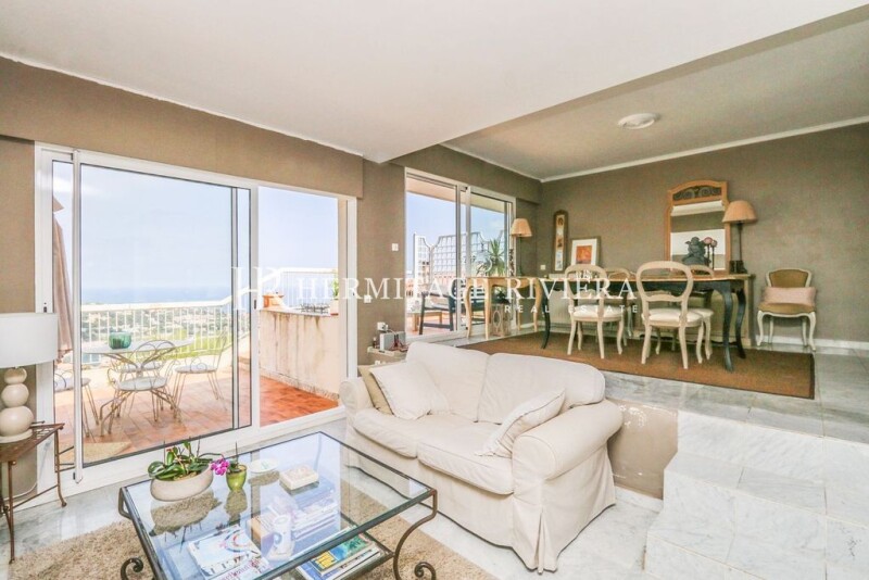 In a closed private estate located on the heights of Villefranche-sur-Mer, an apartment on the top floor of a villa divided into two apartments, offering a beautiful view of the bay of Villefranche. This 2 bedroom apartment of approximately 90 m² consists of a living room with fireplace, a dining room, a separate kitchen. The living room opens onto the 50 m² terrace from where you can admire a very beautiful view of the sea as well as the bay of Villefranche and Saint Jean Cap Ferrat, 2 bedrooms, a WC, a veranda and a bathroom with WC. The area is very quiet and residential close to shops, bus stop and schools. Several parking spaces. Only 25 minutes from the airport and less than 10 minutes from the centre of Nice.