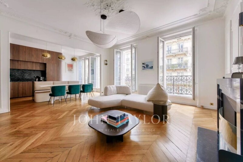 Rue Etienne Marcel. Right in the heart of the capital's "bohemian chic" district, on the second floor with elevator of a freestone building, we offer you a 113 m2 apartment with balcony, entirely renovated with quality materials. The layout offers generous volumes and plenty of storage space. The layout is as follows - Entrance hall - Living room opening onto a kitchen/dining area - Master bedroom with shower room - Two bedrooms - One bathroom - The balcony is accessible from the receptions and the master bedroom. The house has been completely renovated, while retaining its old-world charm with parquet flooring, moldings and fireplace. The whole is very harmonious, with the children's sleeping area clearly separated from the reception area. The bedrooms are beautiful and spacious. A cellar completes this offer.
